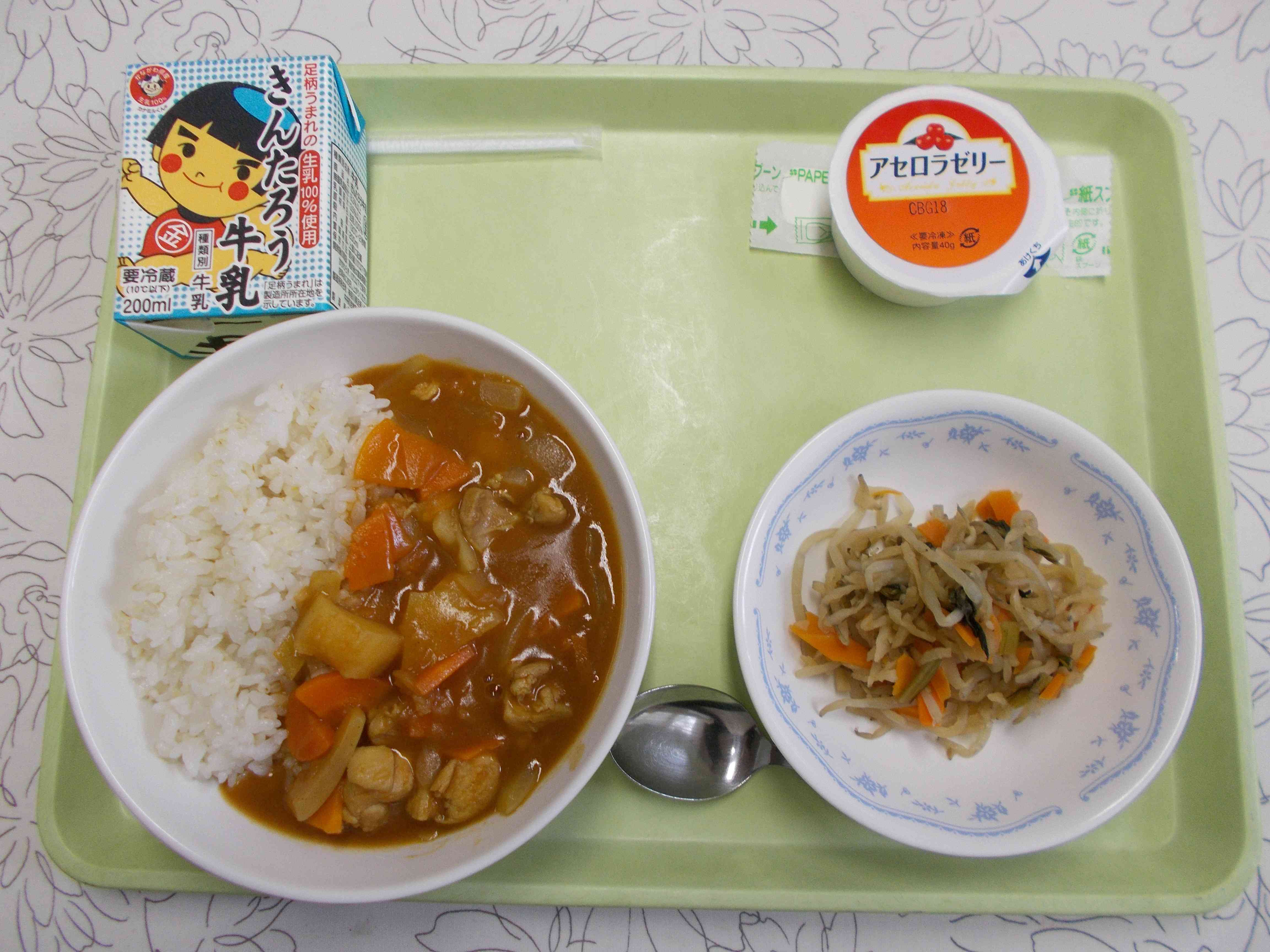 【メニュー】 チキンカレー 牛乳 切り干し大根のナムル アセロラゼリー 【栄養教諭から】 連休明け、みんなの体がシャッキと目覚めるように、今日はスパイシーなチキンカレーにしました。恒例の休み明けのカルシウム強化献立として今回は切干大根をナムルにしました。今週は3日間、天気は悪いようですが、元気に過ごしたいですね。