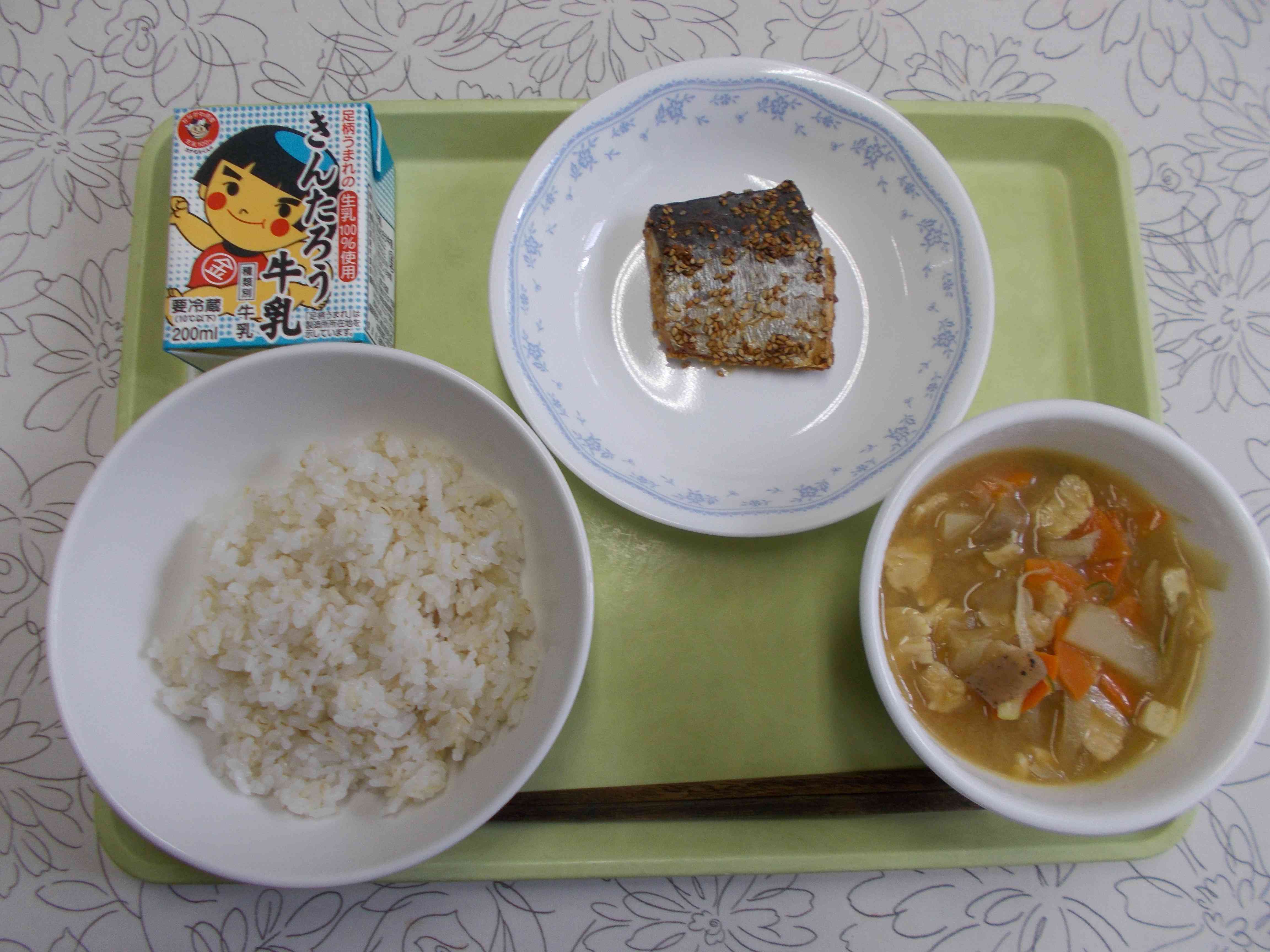 【メニュー】 麦ごはん 牛乳 打ち豆汁 さわらのごま風味焼き 【栄養教諭から】 今日は福井県の郷土料理の「打ち豆汁」です。以前にも何度か出している打ち豆汁は、子どもたちにも人気です。打ち豆は歯ごたえが良く、味も大豆よりうま味が強い気がします。寒くなってきたので、根菜のたくさん入ったお汁がおいしいですね。体も心もぽかぽかです。