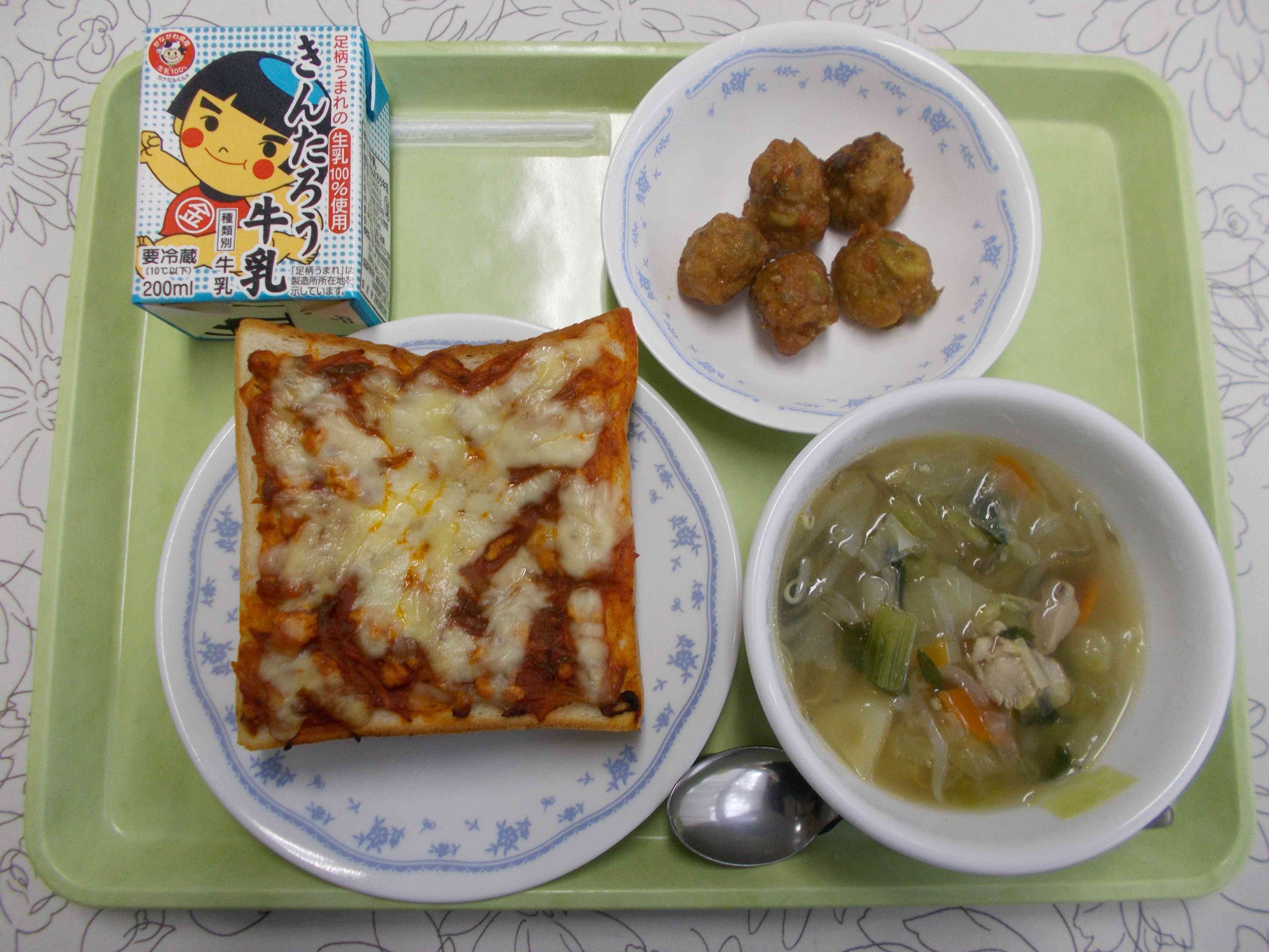【メニュー】 ピザトースト 牛乳 コンソメスープ ガリバタ元気ボール 【栄養教諭から】 今日はピザトーストです。具には野菜と鶏のひき肉を入れました。久しぶりのピザトーストに子どもたちも喜んでいました。ガリバタ元気ボールは、元気ボールという枝豆とじゃこの入ったさつま揚げをガーリックとバターで炒めました。新献立なので、こちらは子どもたちの反応が楽しみです。