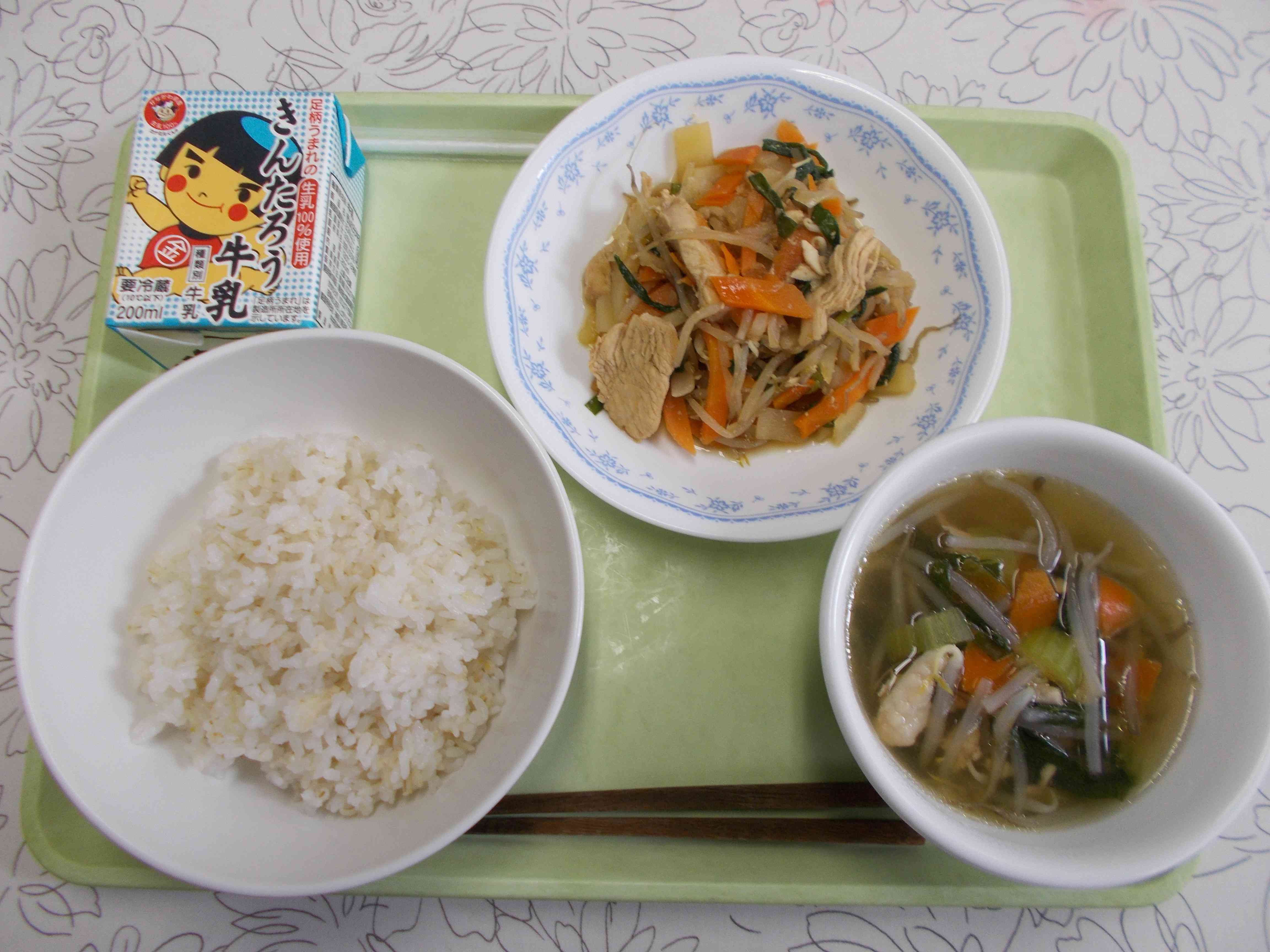 【メニュー】 麦ごはん 牛乳 チンゲンサイのスープ プルコギ 【栄養教諭から】 今日は韓国料理のプルコギです。給食では鶏肉で作るダップルコギです。鶏肉は少し大きめのそぎ切りにし、コチジャンを加えた甘辛ダレにつけこみました。野菜もたっぷり入れてごはんが進むおかずです。