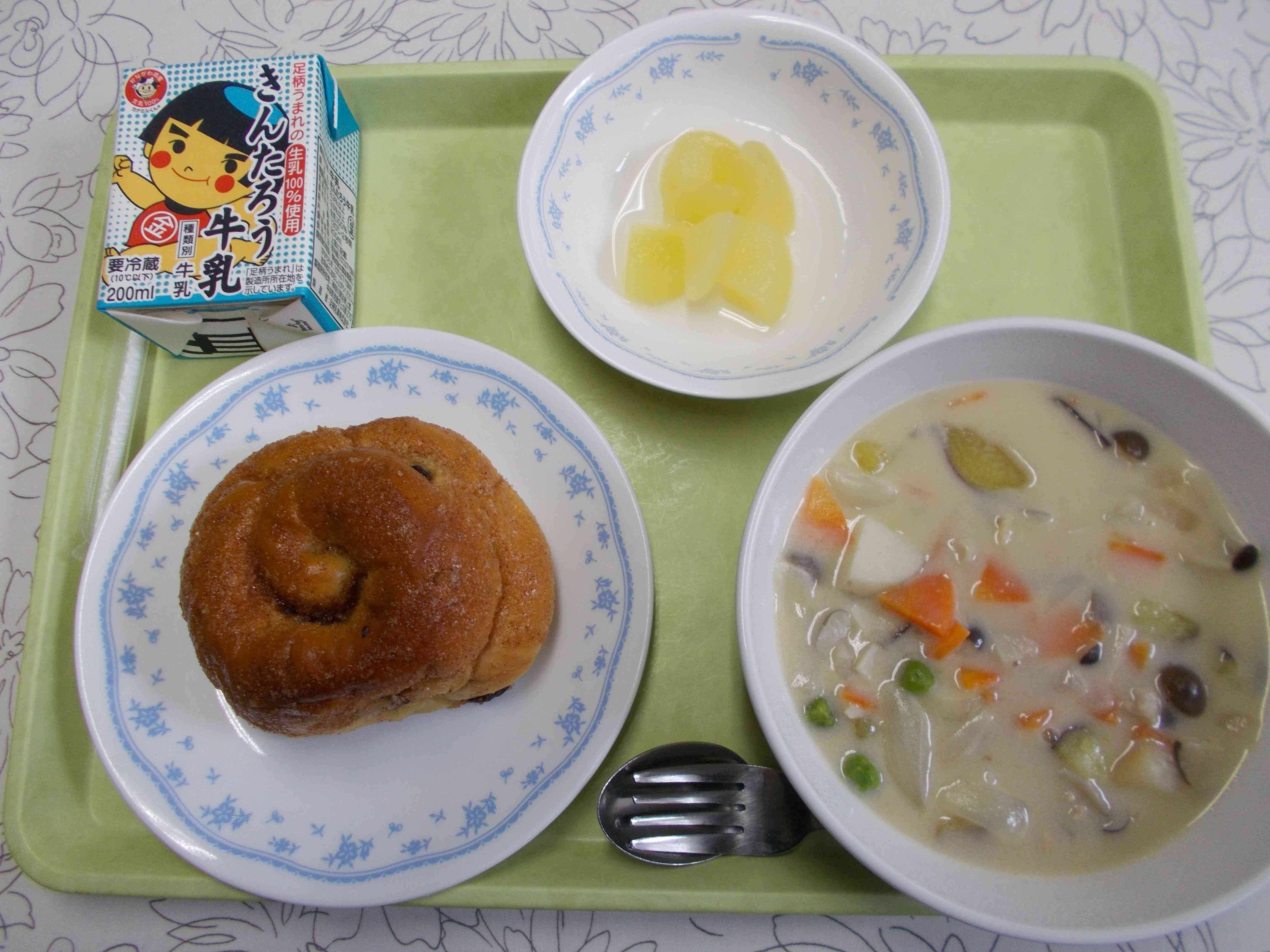 【メニュー】 シナモンロール 牛乳 秋いっぱいシチュー ラ・フランス缶 【栄養教諭から】 今日の秋いっぱいシチューには、秋の味覚をギュッとつめこみました。先日使用した神奈川県産のシルクスイート、里芋、しめじやエリンギ等のきのこ類が入っています。デザートにはこちらもこれからが旬のラ・フランス缶です。缶詰めですが、ラ・フランスの生産量日本一の山形県産の物を使いました。