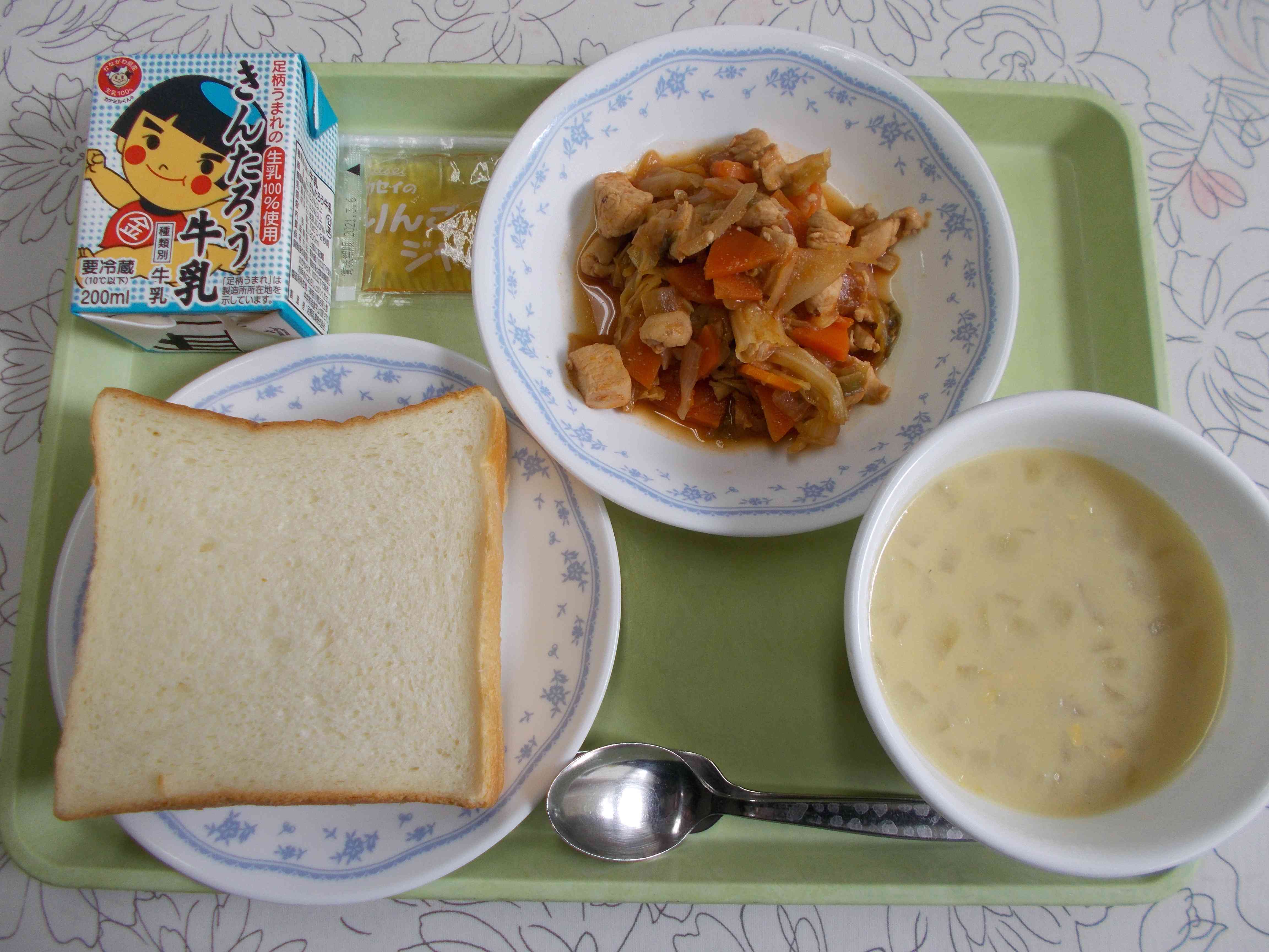 【メニュー】 食パン 牛乳 りんごジャム コーンスープ 鶏肉のケチャップ煮 【栄養教諭から】 今日の鶏肉のケチャップ煮は、以前他校の栄養士さんに教えていただいた「鶏肉のケチャップ焼き」が、とてもおいしく子どもたちにも好評だったので、野菜を加えてアレンジしてみました。「煮る」というよりは、味をからめる感じにしました。すりおろしたにんにくとケチャップ、しょうゆ、日本酒で作るソースがとてもおいしいです。パンによく合う献立です。【添付ファイル】