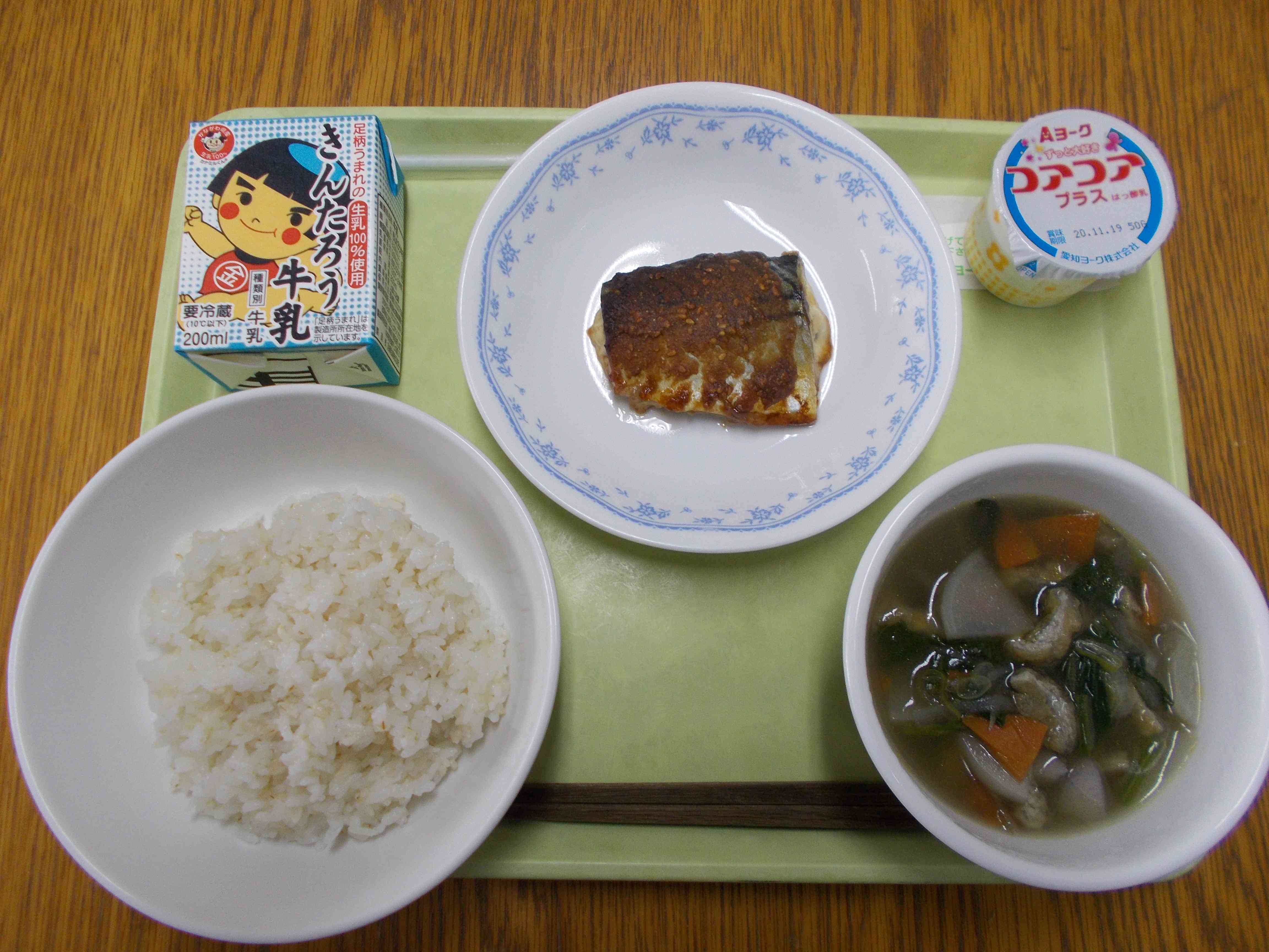 【メニュー】 麦ごはん 牛乳 冬野菜汁 鯖のごまみそ焼き コアコアプラス 【栄養教諭から】 今日は冬野菜をたくさん使ったおつゆです。かぶ・ほうれん草・長ねぎ・里いもなどが入っています。また、ごぼうや人参の根菜類は体をあたためる働きがあります。寒くなってきましたので、体の中からあたためてくれる食物を積極的に摂りたいですね。