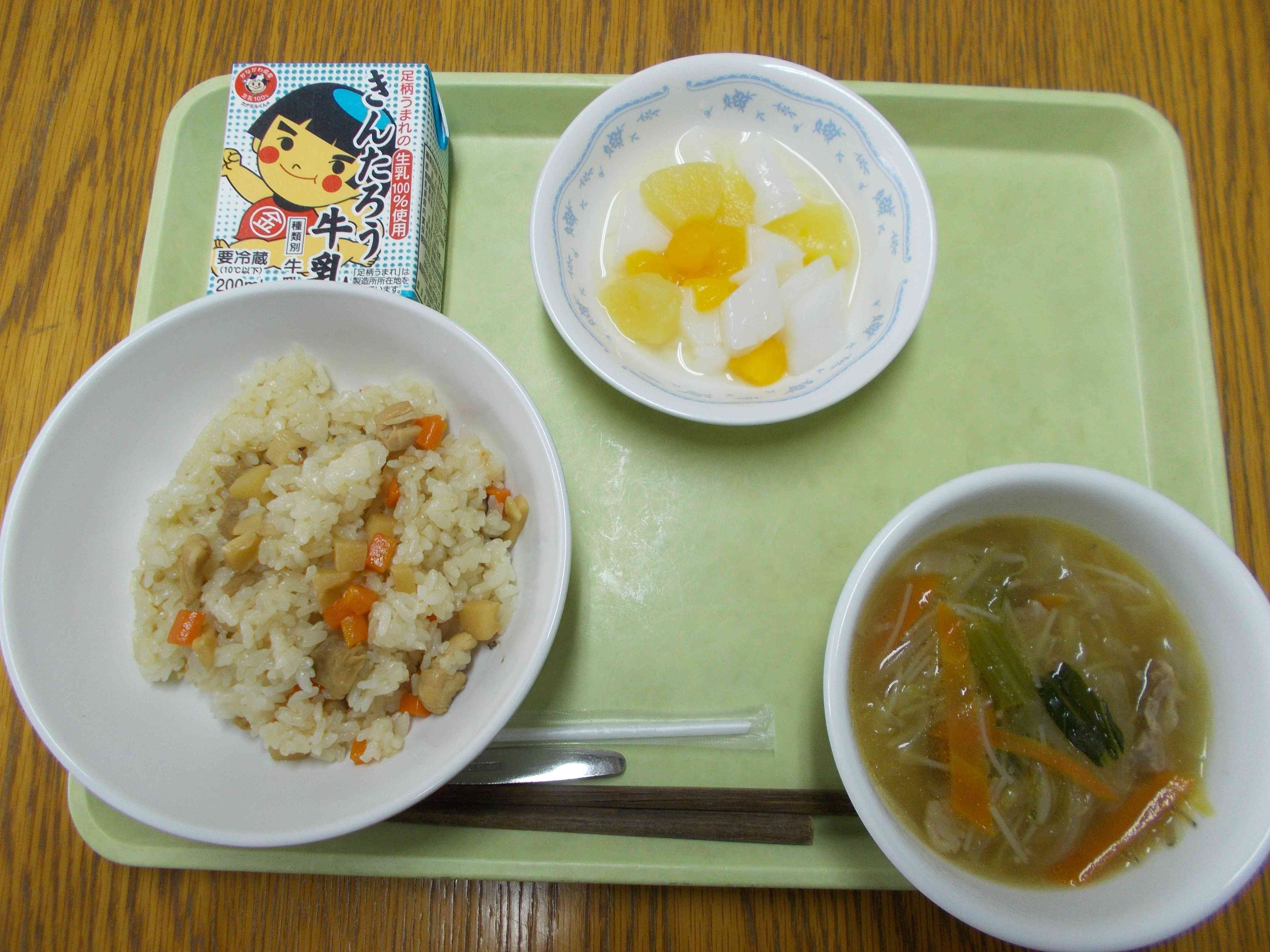 【メニュー】 中華風おこわ 牛乳 ビーフンスープ 杏仁フルーツ 【栄養教諭から】 今日は中華おこわです。たけのこや干しシイタケ等の具をごま油で炒めて混ぜました。本来は、もち米と一緒に炊き込みたいところですが、炊飯器の容量の関係で、具は別で作り、炊けたところに混ぜ込んでいます。おこわは子どもたちにも大人気です。