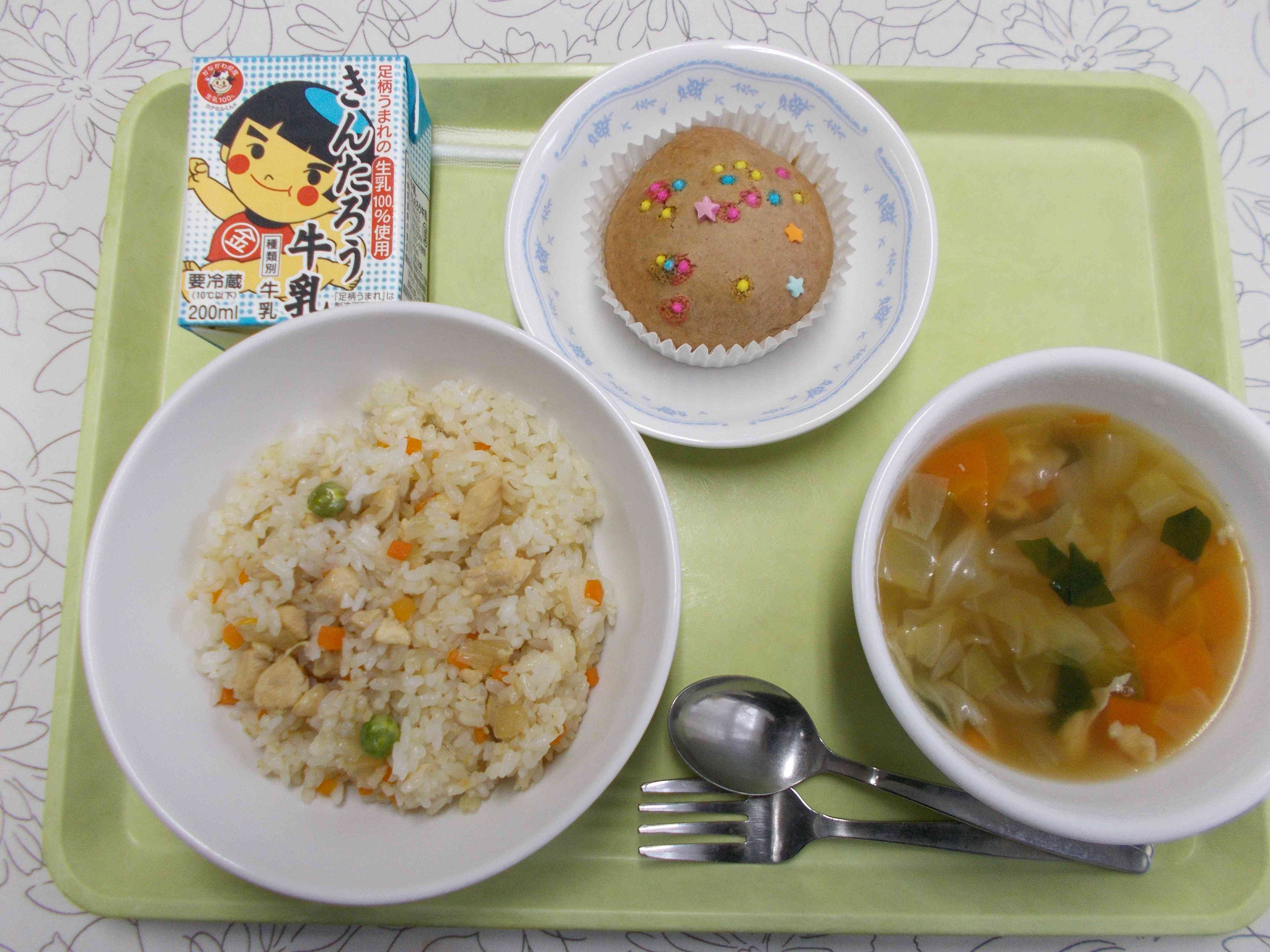 【メニュー】 チキンピラフ 牛乳 ABCスープ チョコケーキ 【栄養教諭から】 図書コラボ給食2日目は、「ぐりとぐらのおきゃくさま」からチョコレートケーキがリクエストされました。前代未聞の難題でした。調理後の温度がきちんと確認できることやアレルギーへの配慮等を踏まえると、絵本のようにはできませんが、せめて特別感のあるケーキをと思い、絵本のようにトッピングシュガーでデコレーションしました。