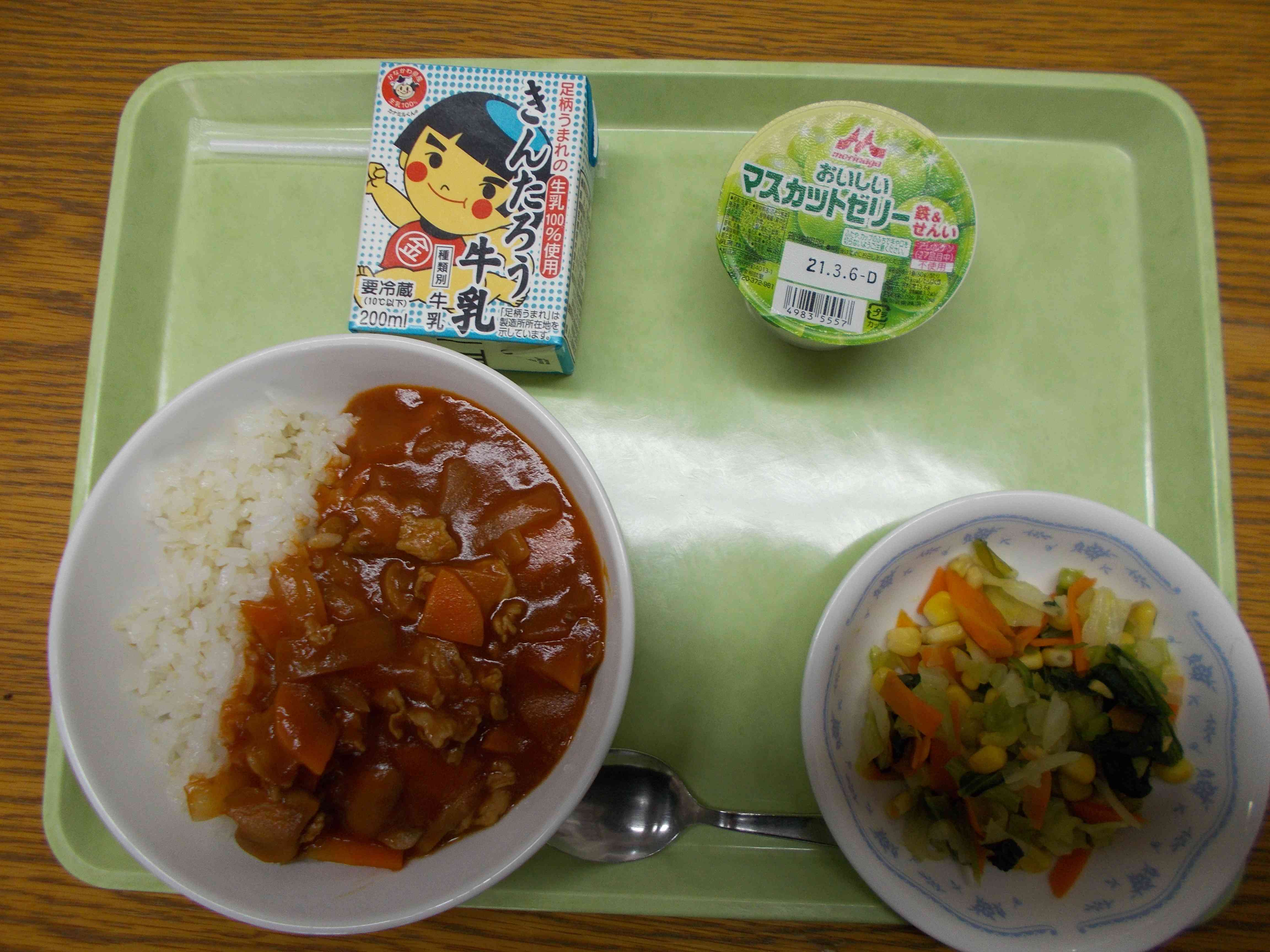 【メニュー】 ハヤシライス 牛乳 カラフルソテー マスカットゼリー 【栄養教諭から】 今日は短縮日課のため、パッパと食べられるハヤシライスです。給食室でルウから作るハヤシライスは絶品です。給食でよく出るマスカットゼリーにはFe(鉄分)などの普段取りにくい栄養素がプラスされています。