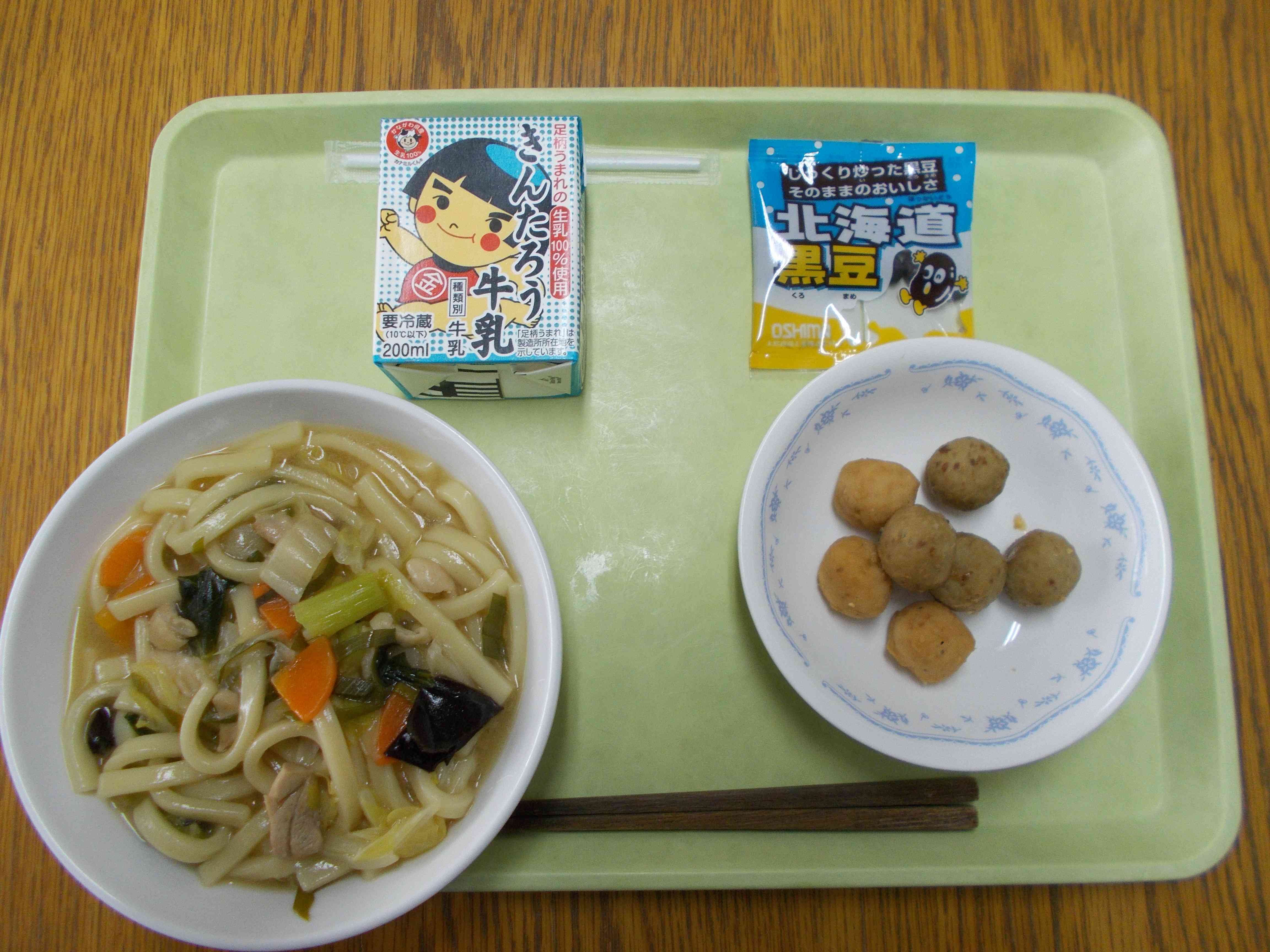 【メニュー】 あんかけうどん 牛乳 お魚ボールの甘辛煮 節分黒豆 【栄養教諭から】 今日は節分です。124年ぶりの2月2日だそうですね。最近は、節分といえば恵方巻を食べることが定着しつつありますが、本日の給食は原点回帰で、福豆といわしを取り入れました。福豆は黒豆バージョンを、いわしは子どもたちにも食べやすいようにいわしボールを甘辛味で煮ました。暦の上では春になりますが、給食室は極寒です。