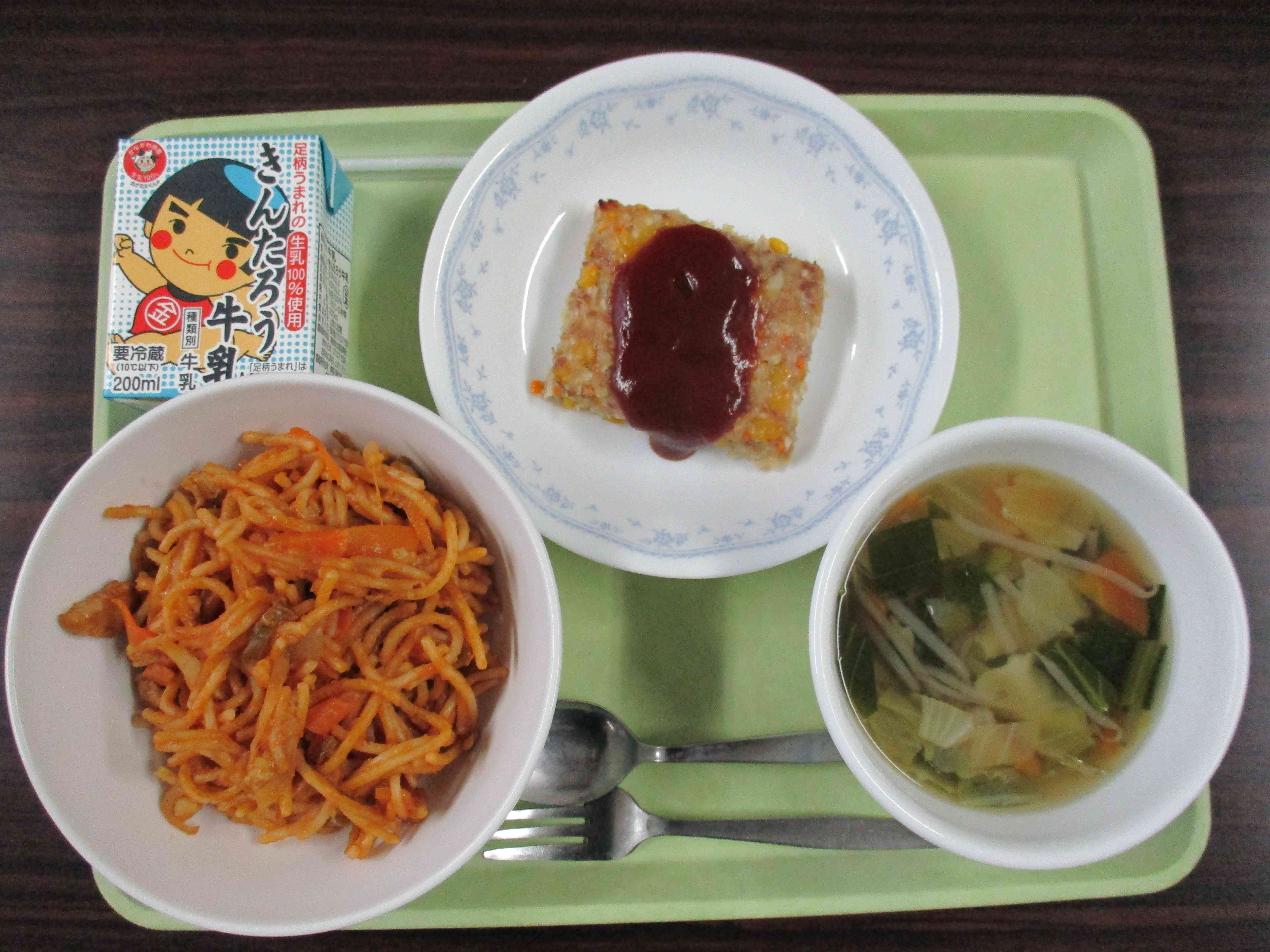 【メニュー】 スパゲッティナポリタン 牛乳 コンソメスープ ミートローフ 【栄養教諭から】 今日はミートローフです。ミートローフの「ローフ」とは、かたまりを意味します。ひき肉に玉ねぎやスパイスを合わせて、型につめて焼き、それを切り分けて食べるのが本来のミートローフです。給食では、鉄板に敷き詰めて焼きました。私は、ミートローフの時には、玉ねぎだけでなく、グリーンピースやコーン、角切りの人参を中に入れます。具が入っていることを喜ぶ子もいれば、グリンピースがちょっと苦手という子もいて、子どもたちの反応は様々です。【添付ファイル】
