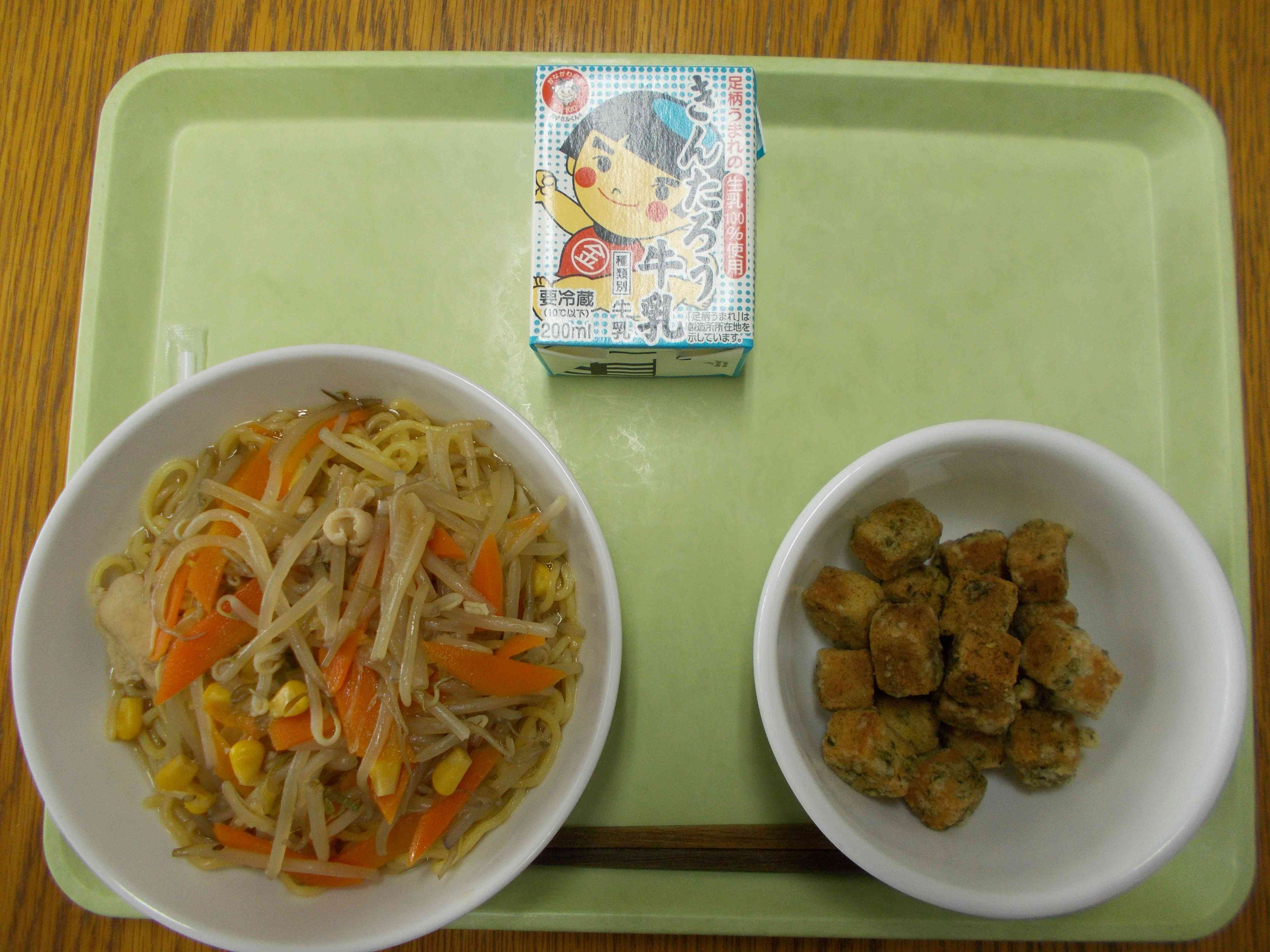 【メニュー】 みそラーメン 牛乳 高野豆腐の磯辺揚げ 【栄養教諭から】 今日は高野豆腐を磯辺揚げにしました。調味液に青のりをたっぷり加えて、高野豆腐にしみこませ、衣にでんぷんをまぶして揚げます。外はサクッと中はふかふかで、パクパク食べられてしまいます。簡単ですので、おやつにもよいかもしれません。カルシウムも豊富です。