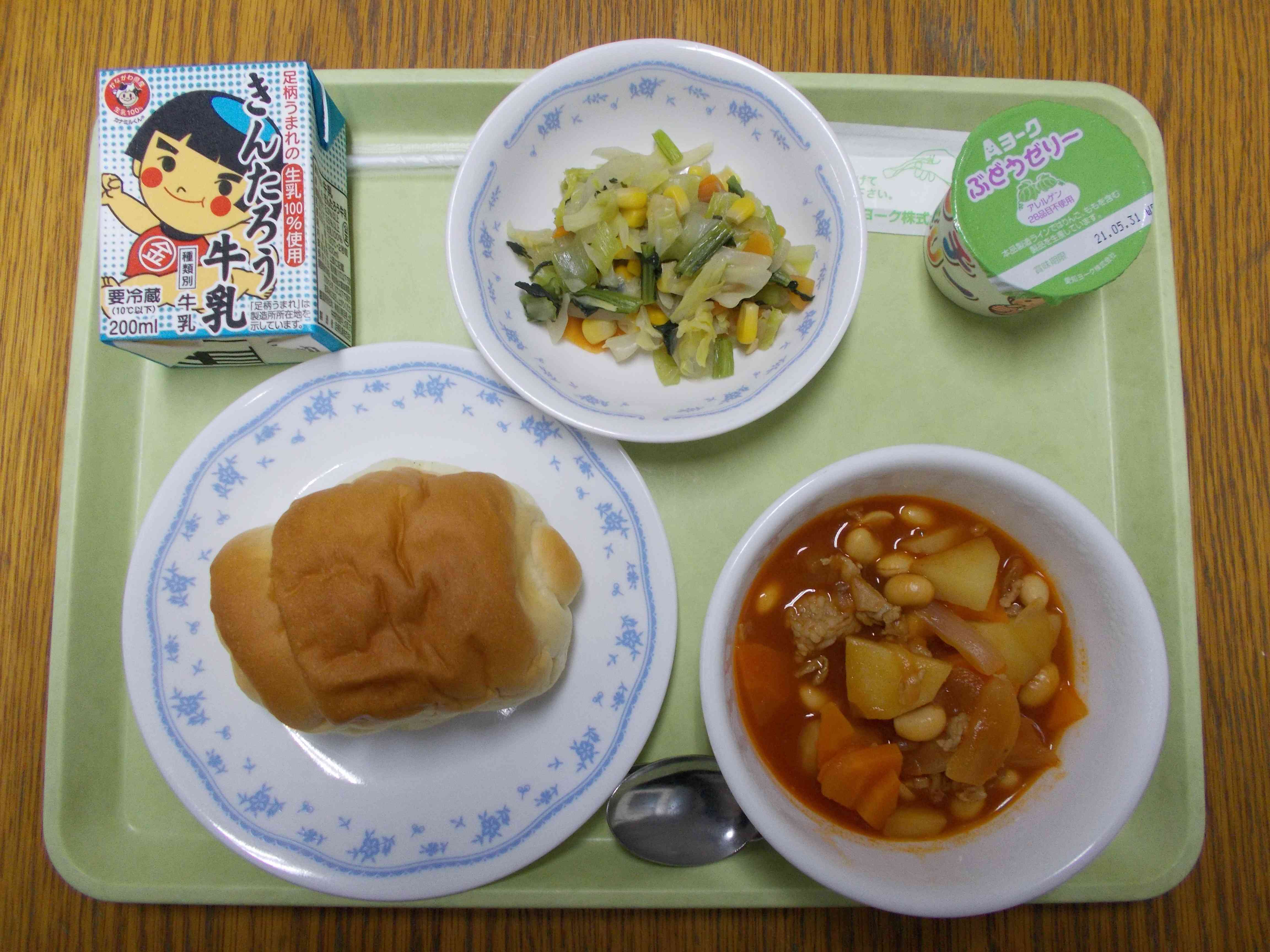 【メニュー】 ロールパン 牛乳 ポークビーンズ 青菜とコーンのソテー ぶどうゼリー 【栄養教諭から】 今日は大豆たっぷりのポークビーンズです。朝から大豆をゆでたので、ほんのり甘い香りがただよっていました。「大豆」は「大切な豆」というのが名前の由来です。栄養満点で体にとって大切な豆、そして豆腐や納豆、しょうゆやみそなど和食にとっても大切な豆ですね。