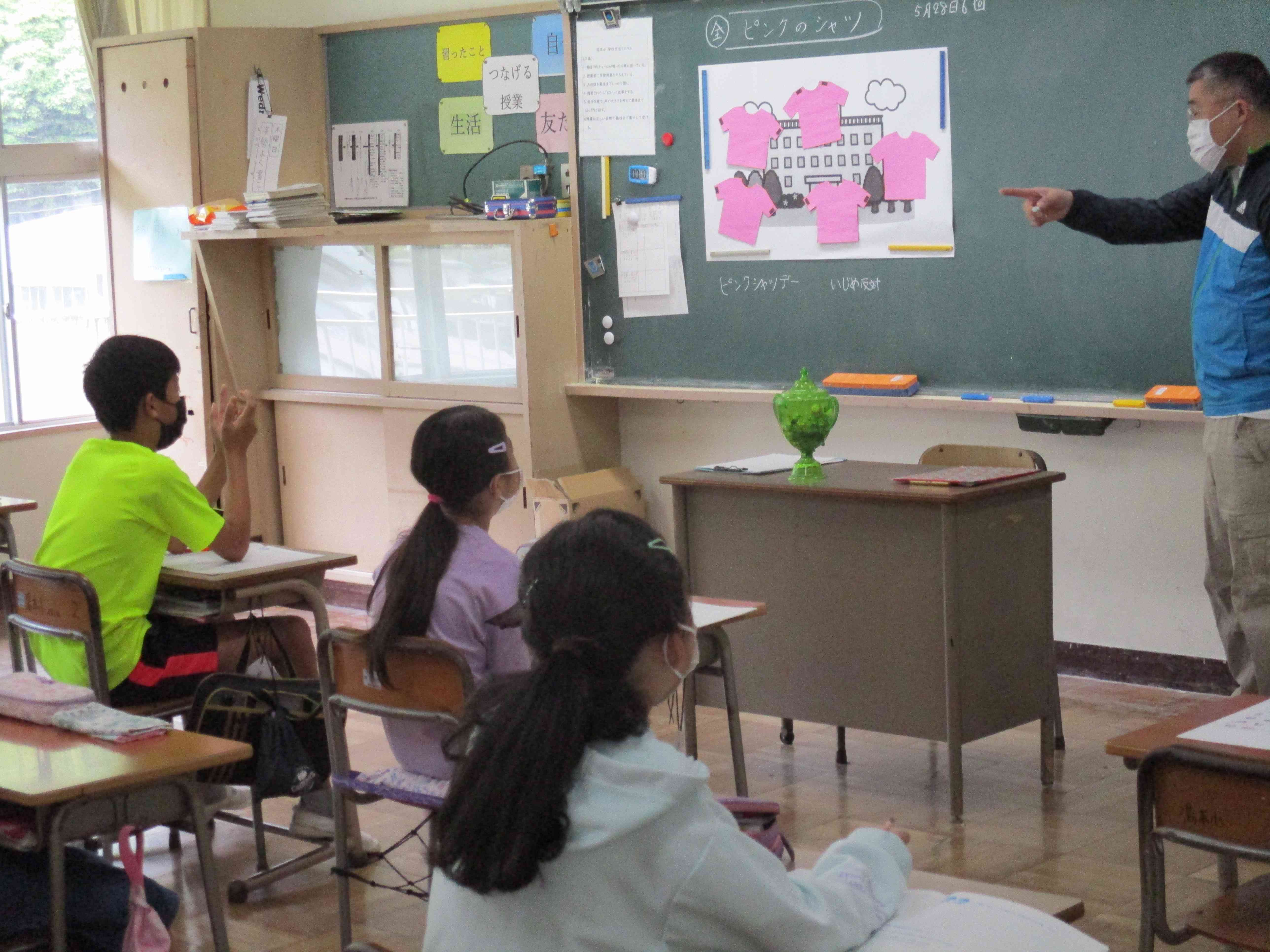 5月28日の全校道徳は「いじめ防止月間」に合わせて、「いじめストップ!ピンクシャツデー」という話をしました。 ピンクシャツデーとは、カナダで始まった運動です。 ある男の子がピンクのシャツをからかわれ、いじめにあいました。その翌朝、2人の上級生の「僕らもピンクのシャツを着ていじめストップを!」との提案に賛同した学生たちがピンクのシャツや小物を身につけて登校し、校舎はピンク色に。いじめストップにつながったそうです。それ以降2月最終水曜日をピンクシャツデーとし、世界70か国以上のワールドアクションに繋がっています。 全校道徳での「ピンクシャツデー」の話をもとに各学級の道徳の時間に「いじめ」について考えました。 学級での話し合いの後、ピンクのTシャツに行動目標を書きました。 「いじめはしない」 「悪口をいわない」 「人の気持ちを考える」 「けんかはしない」 「仲良くする」 「味方だよって伝えてあげる」 「みんな違ってみんないい」等【添付ファイル】