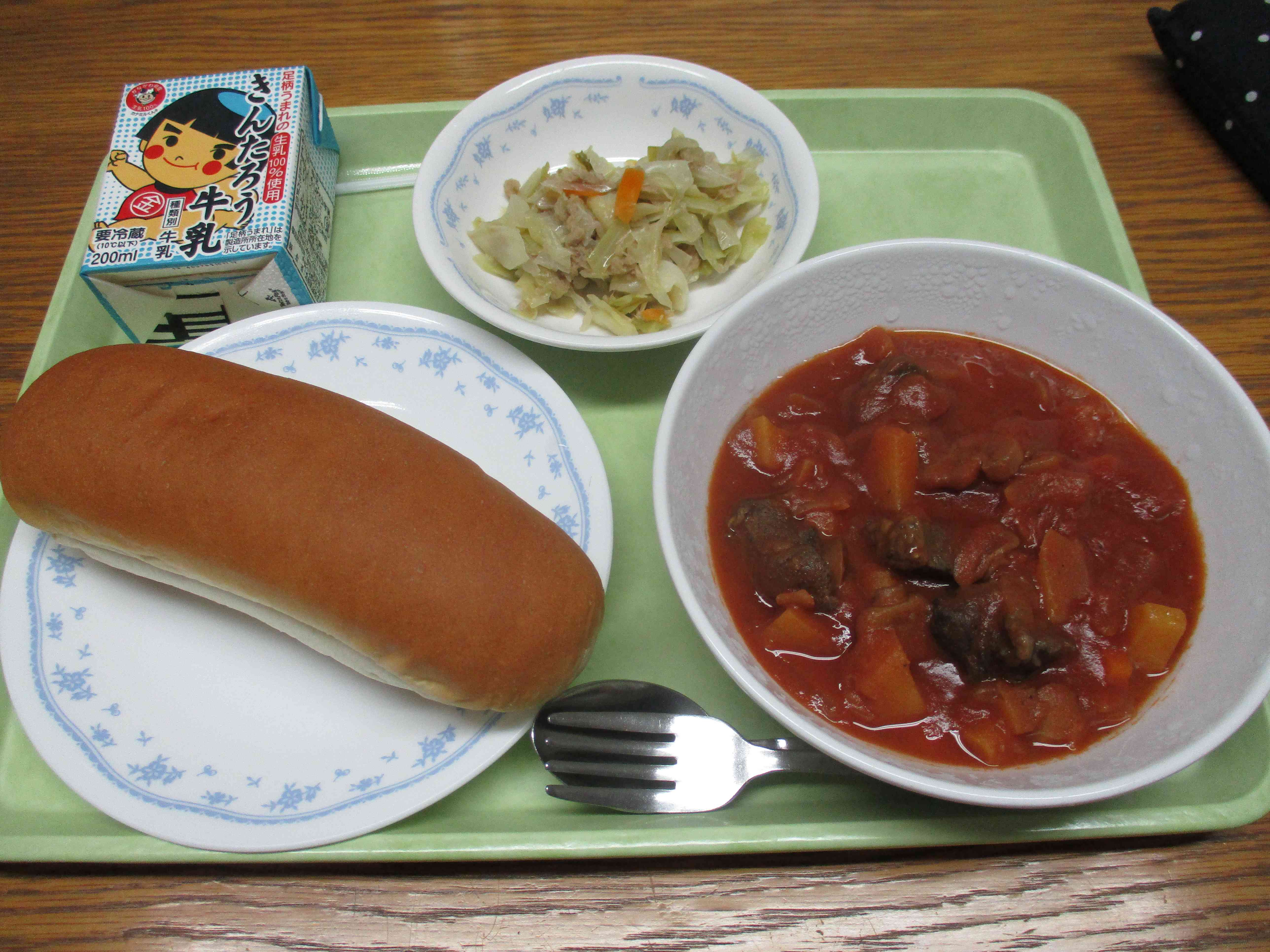 【メニュー】 コッペパン 牛乳 ポークシチュー キャベツとツナの炒め物 【栄養教諭から】 今日は、ポークシチューです。2cm角と大きめにカットしてもらった豚肉ですが、別なべでコトコト煮込むうちに、だいぶ小さくなり、ちょうど子ども達の一口大になります。トマトの酸味を残しつつ、コクのある仕上がりになるように、丁寧にルウを作りました。