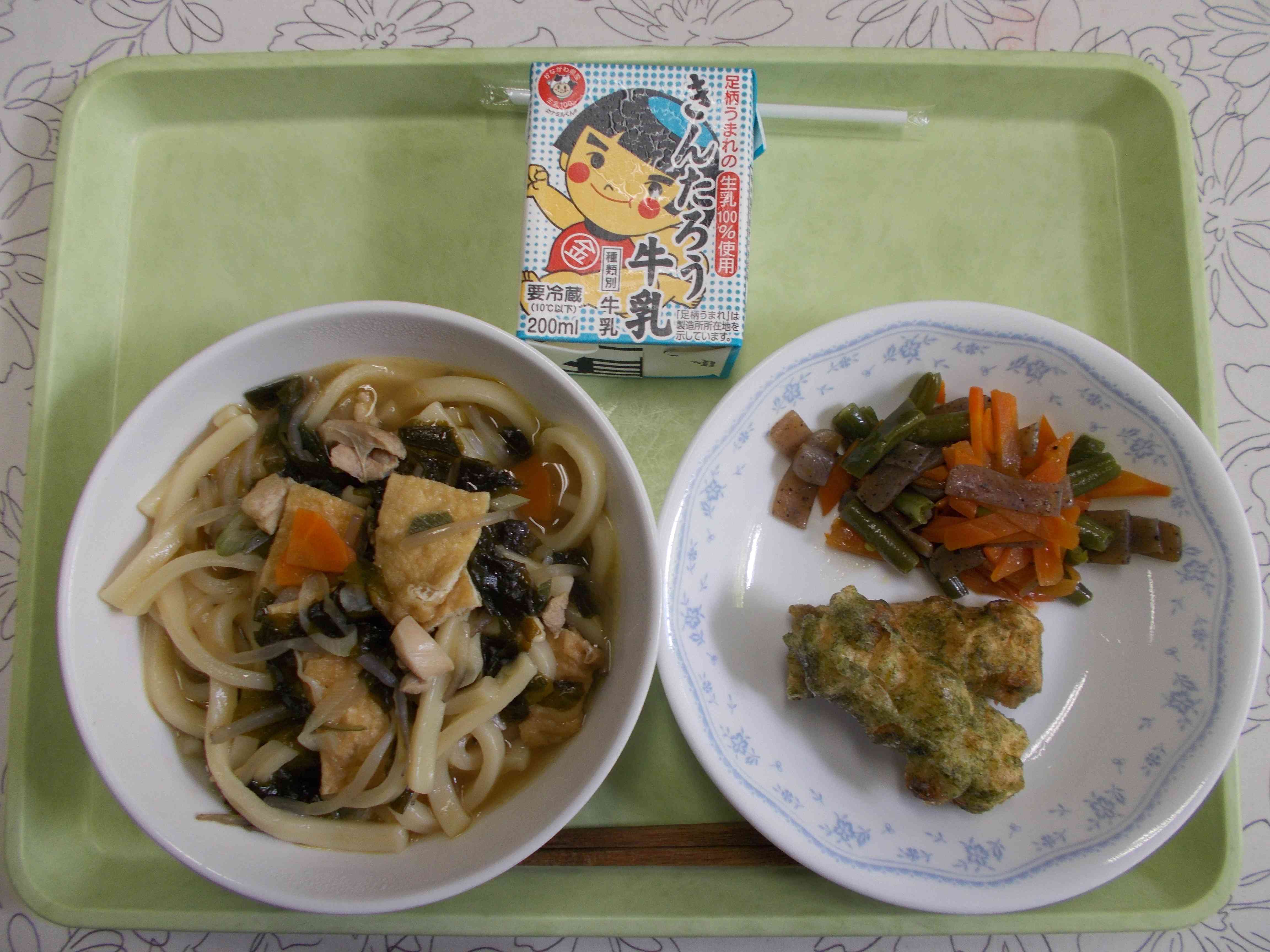 【メニュー】 きつねうどん 牛乳 竹輪の磯辺揚げ こんにゃくとにんじんの金平 【栄養教諭から】 今日は香りのよい青のりをたっぷり使ったちくわの磯辺揚げです。青のりに似た物で青さ粉という物もあります。あおさという海そうをフレーク状にしたもので青のりの代わりに使用されます。本物の青のりは糸のように細長い形が特徴です。ぜひ使う際は、香りと味の違いも比べてみてくださいね。