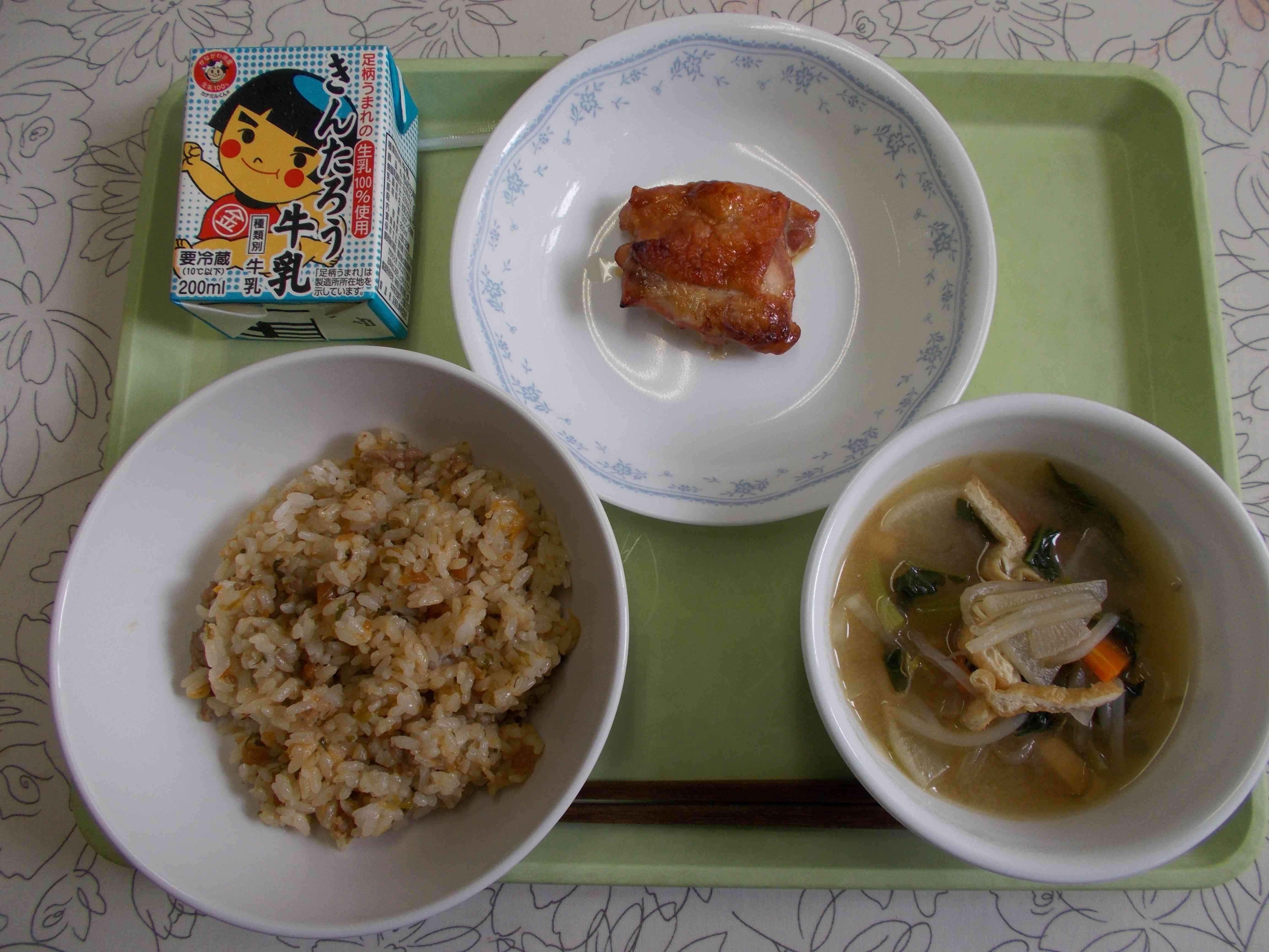 【今日の献立】 キムタクごはん 牛乳 具だくさんみそ汁 鶏の照焼き 【栄養教諭から】 今日は大人気キムタクごはんです。夏休み前に、給食だより夏休み号で、キムタクごはんのレシピをのせました。何人もの保護者の方や先生方から作ったと声をかけていただきました。とっても簡単で、休みの日のお昼にはぴったりです。今日は短縮日課に合わせてささっと食べられるこのメニューにしました。