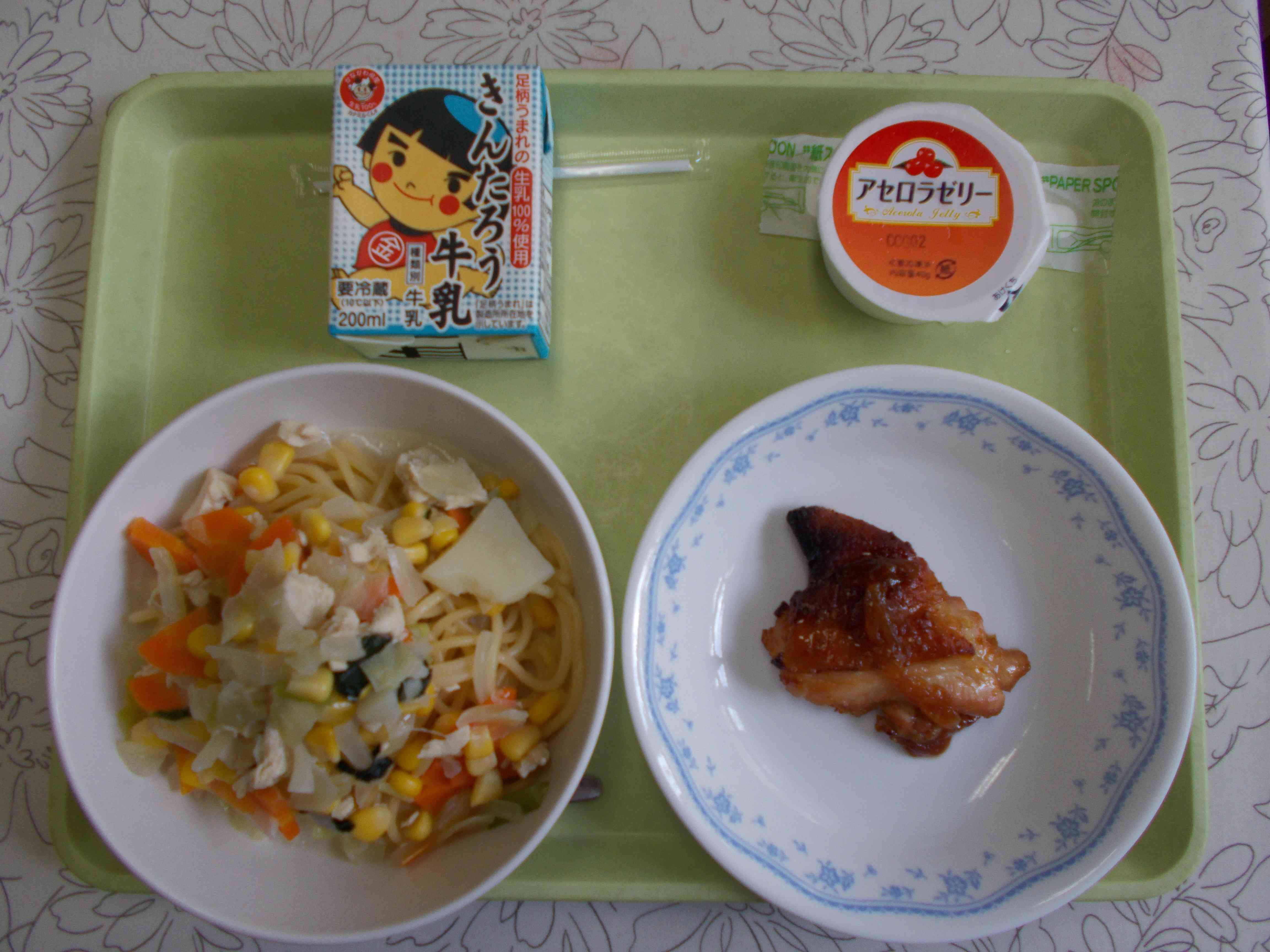 【今日の献立】 豆乳スープパスタ 牛乳 ママレードチキン アセロラゼリー 【栄養教諭から】 今日は豆乳を使ったクリームパスタです。スープには野菜をたくさん入れました。ママレードチキンは鶏肉をママレードジャム、すりおろしたにんにく、白ワイン、しょうゆなどで漬け込みます。ママレードのさわやかな甘さとしょうゆがとても合います。