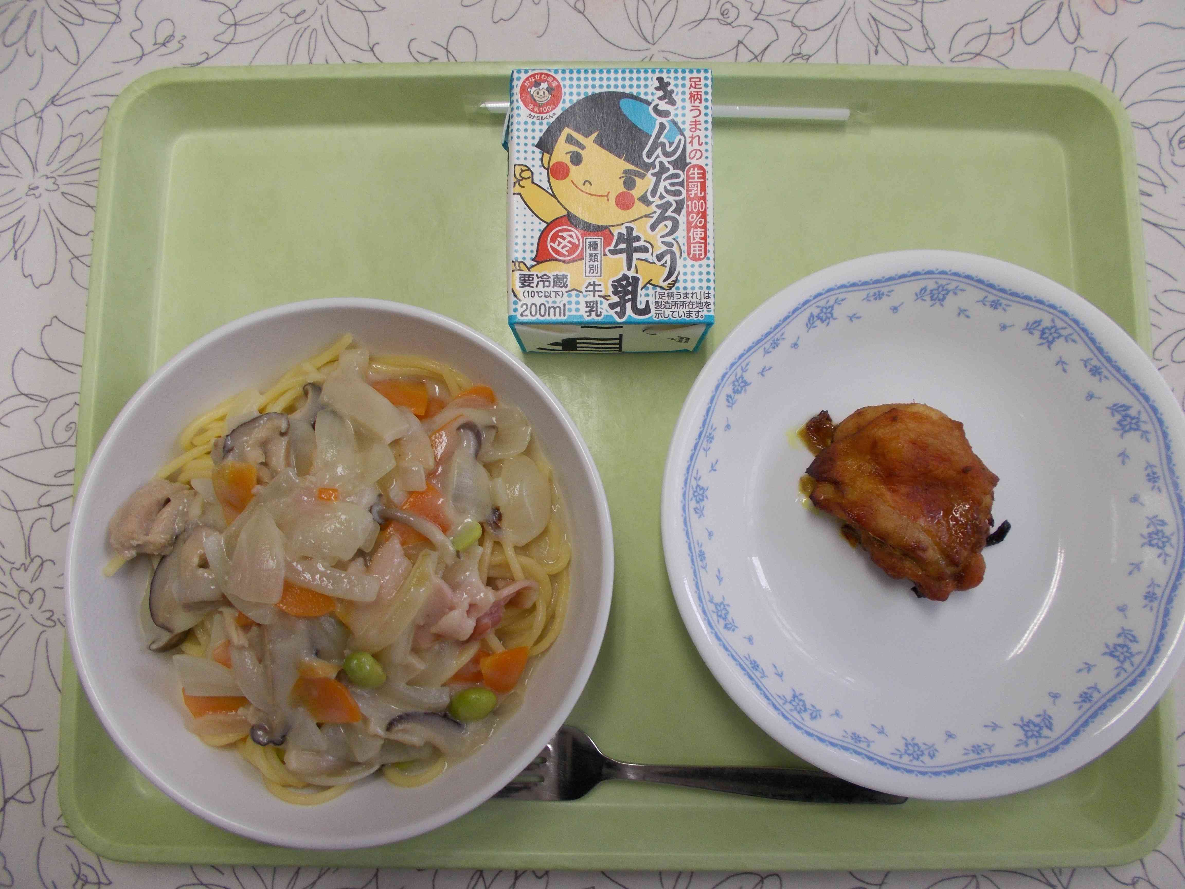 【今日の献立】 スパゲティクリームソース 牛乳 カレーグリルチキン 【栄養教諭から】 今日は旬のきのこをたっぷり使ったクリームスパゲティです。しいたけ、しめじ、エリンギの3種類が入っていてうま味もつまっています。きのこが苦手な子が多いので、香りの強いベーコンを加えて少しでも食べてもらえるよう工夫しました。食物繊維たっぷりです。