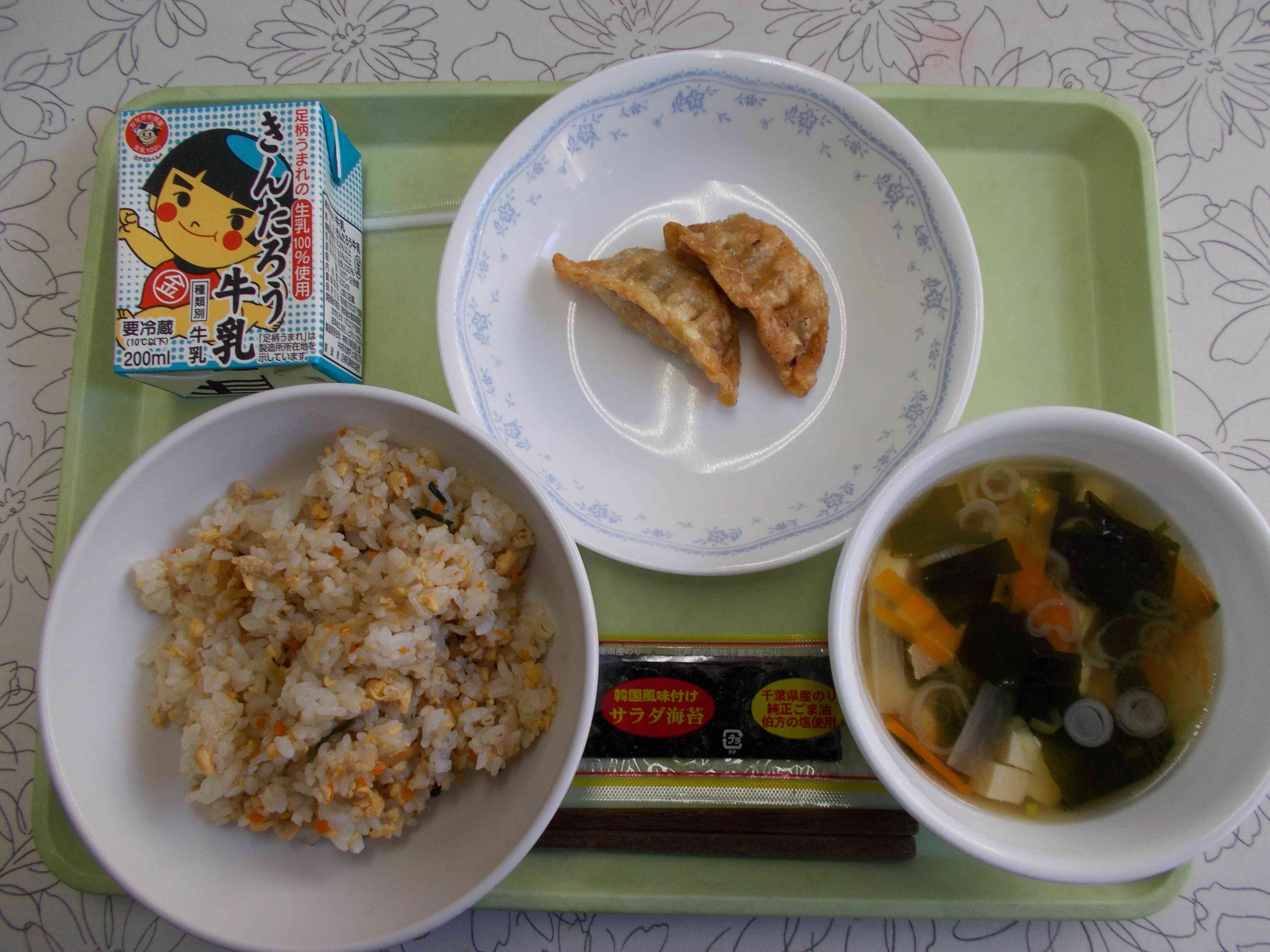 【今日の献立】 韓国風まぜご飯 牛乳 韓国のり わかめスープ 揚げおさかなくんギョウザ 【栄養教諭から】 今日ははこねランチで「韓国風まぜご飯」です。自分で韓国のりを巻いて韓国ののり巻き「キンパ」を作って食べます。ごま油の香りとたくあんの歯ごたえがおいしいポイントです。本来は具をきれいに入れて巻きますが、給食ではまぜご飯にしました。