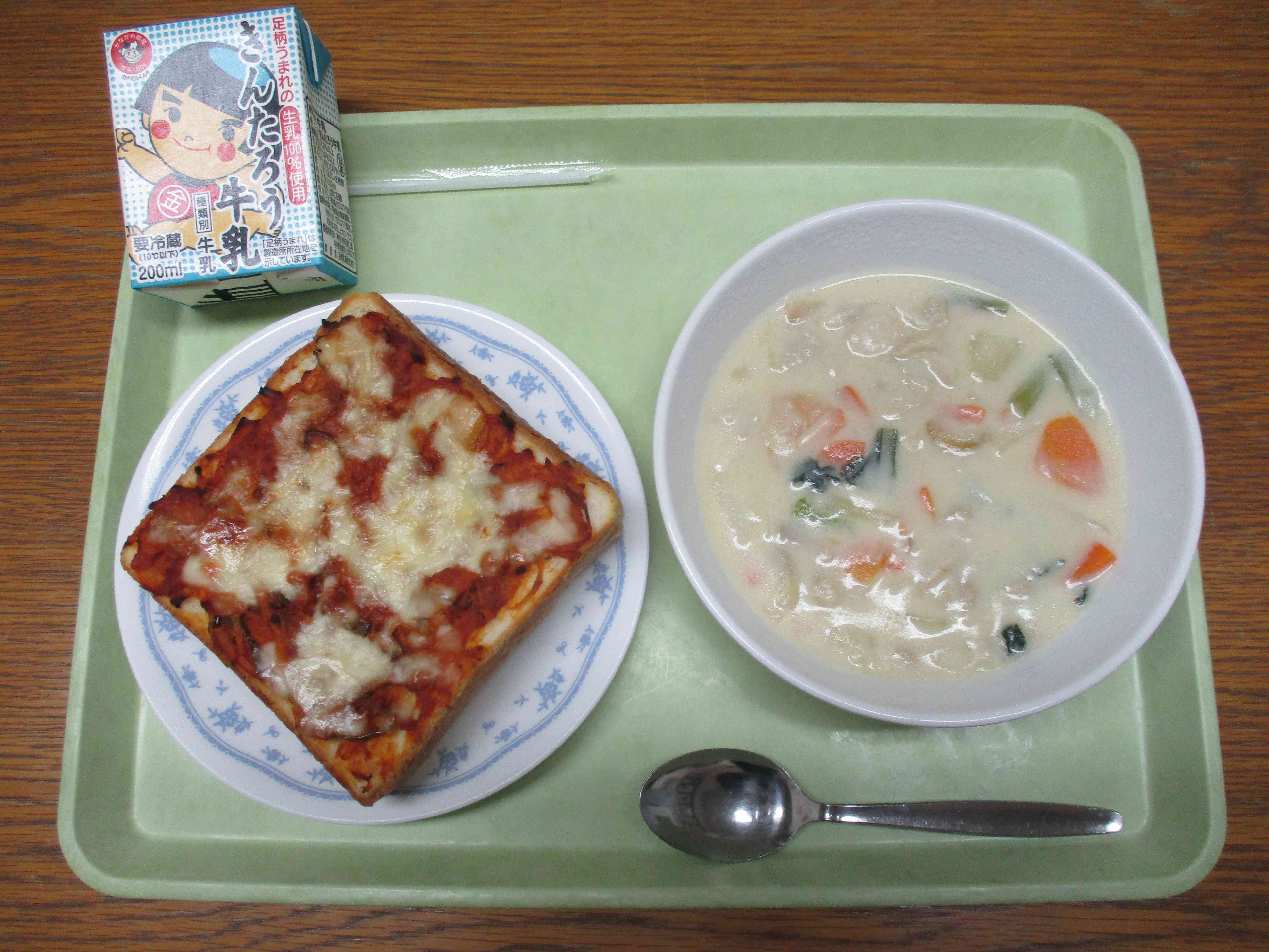 【今日の献立】 ピザトースト 牛乳 ホワイトシチュー 【栄養教諭から】 今日のピザトーストは、ツナピザです。パンの大きさは、学年に合わせて3段階に分けています。低学年は、8枚切りを使いますが、薄くトーストすると固くなるので、4枚切りをななめにカットし、三角トーストにします。 固くなりやすいので、温度と時間に気をつけながら焼きました。