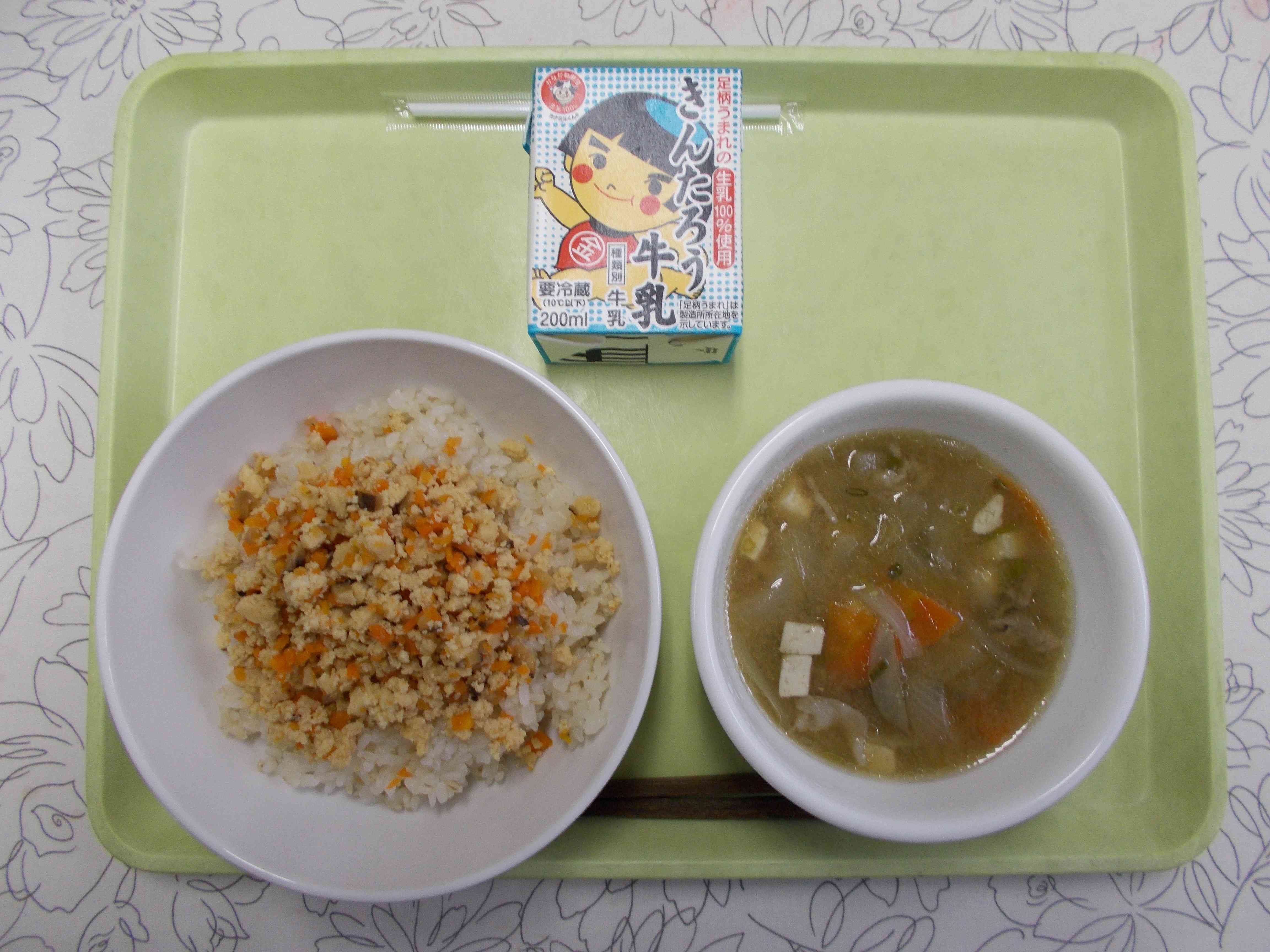 【今日の献立】 高野豆腐のそぼろ丼 牛乳 豚汁 【栄養教諭から】 今日はとても寒く、温かい豚汁が体にしみます。今日の豚汁には里芋を入れました。これからが旬の野菜です。里芋といえば大きな葉が特徴ですね。もともとはジャングルなど温かい地域が原産の植物で、木々の生い茂った中でもたくさんの光を取りこめるように、くきが長く大きな葉になったそうです。くきを干した「芋がら」も煮物にするとおいしいですね。