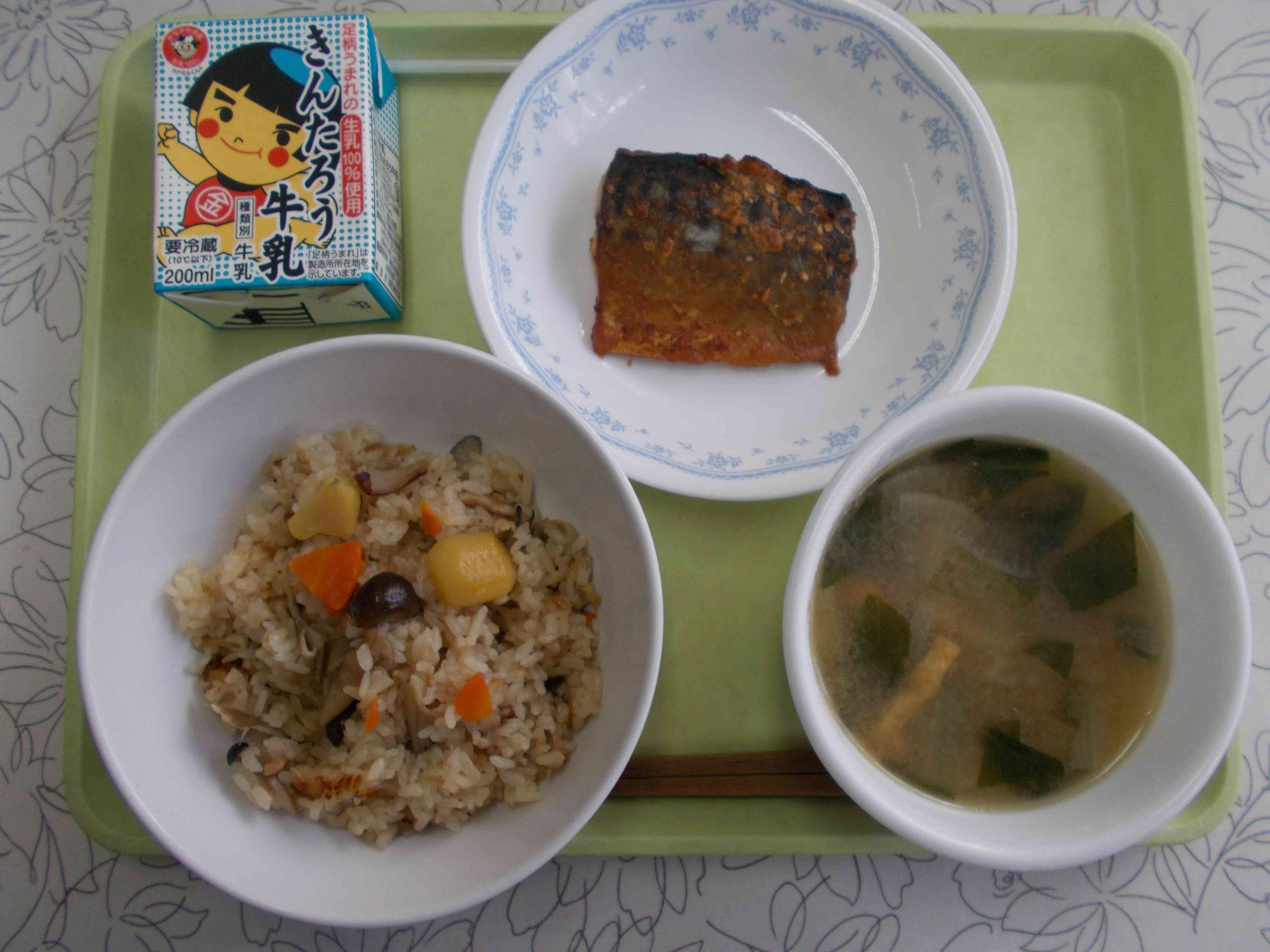 【今日の献立】 秋の香りごはん 牛乳 かぶのみそ汁 さばのピリから焼き 【栄養教諭から】 今日は秋の味覚をつめこんだおこわ「秋の香りごはん」です。くり、しめじ、舞茸を入れました。 一説では、「初めて見つけて食べた時、あまりのおいしさに踊りだした」というのが舞茸の名前の由来です。今日は少し具を大きめに入れてしっかり秋を堪能できるようにしました。