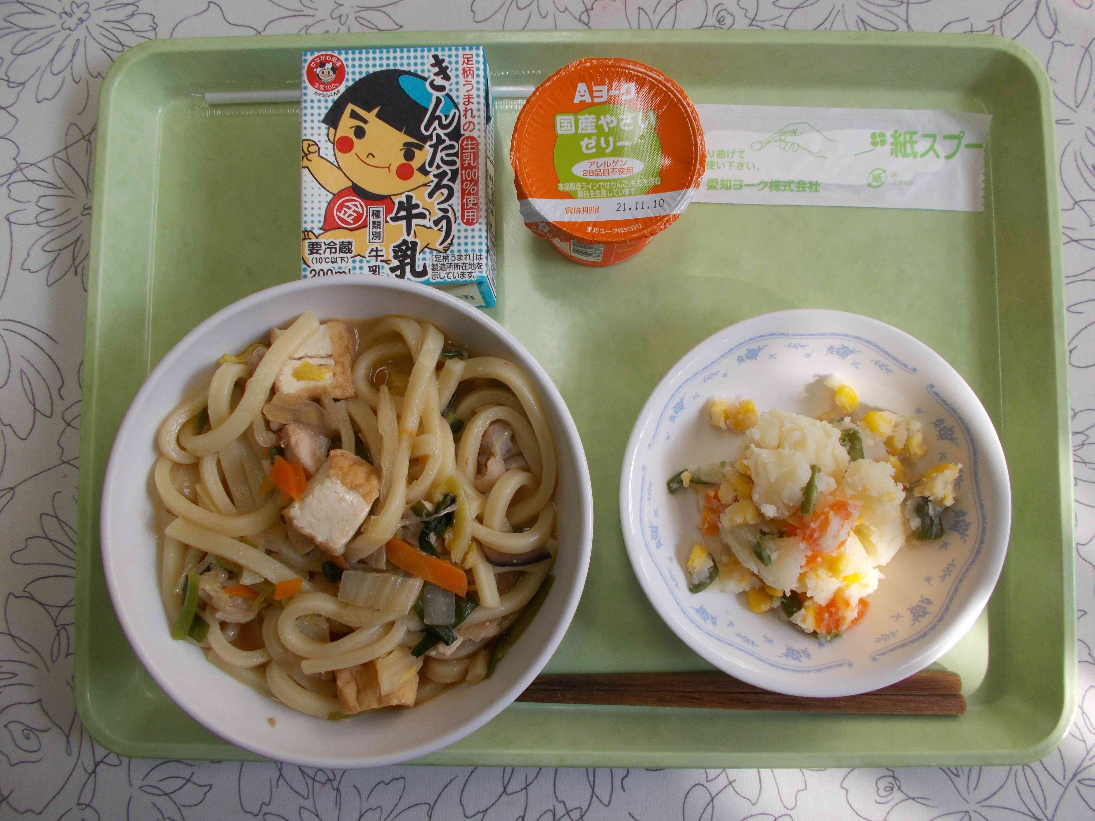 【今日の献立】 チゲうどん 牛乳 三食ポテト 野菜ゼリー 【栄養教諭から】 今日はちょっとピリ辛のチゲうどんです。辛味にはコチジャンとトウバンジャンを少量加えました。ベースはみそ味です。 最近、急な寒さや朝晩の気温の変化により、かぜひきの子が増えています。温かく栄養満点のうどんで元気をつけてほしいです。