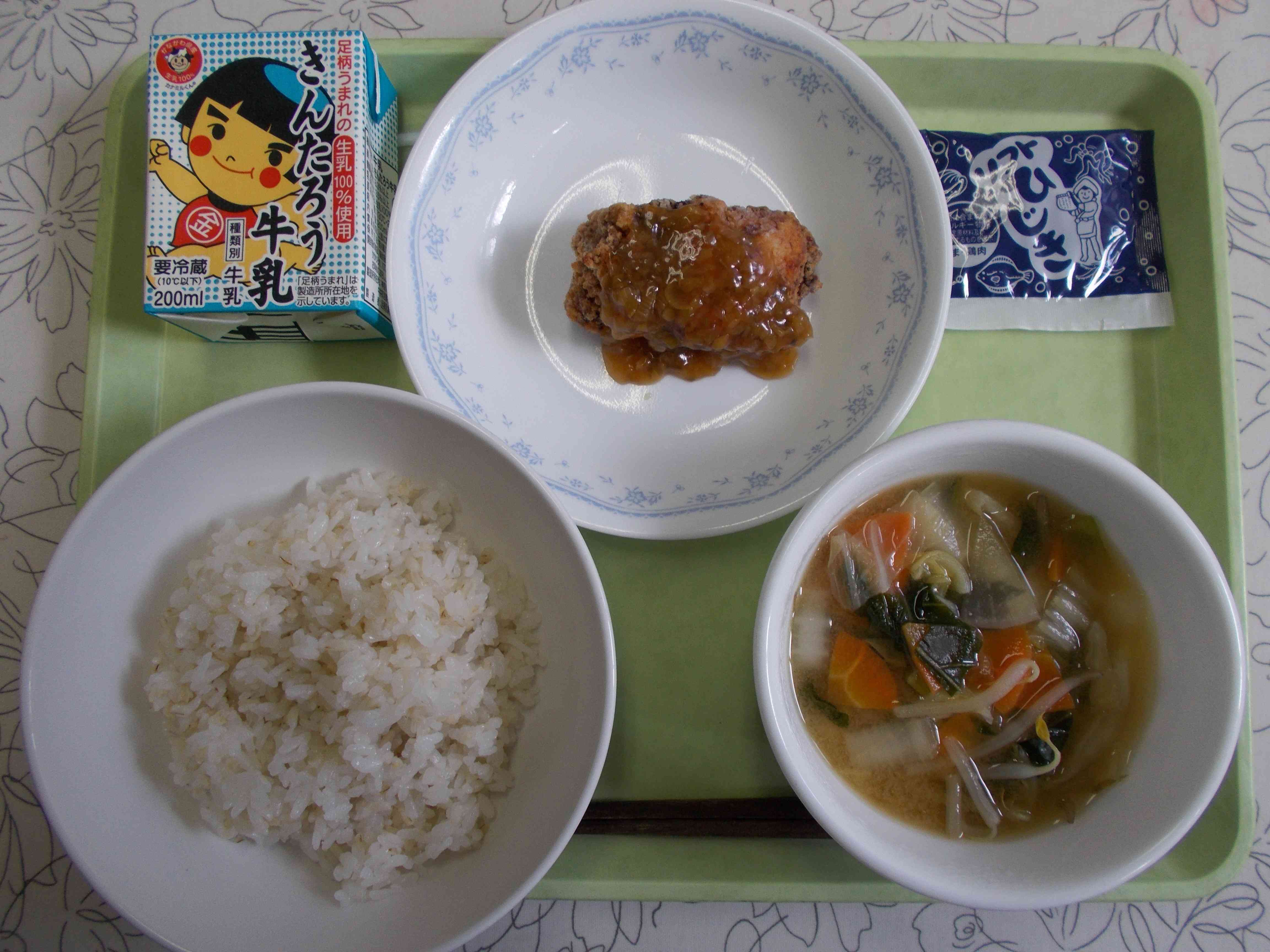 【今日の献立】 麦ごはん ソフトひじき 牛乳 野菜のみそ汁 鶏のから揚げ 【栄養教諭から】 11月から給食のお米も新米が届きました。神奈川県産の「はるみ」です。平塚生まれのこのお米は、湘南の「晴れた海」が名前の由来となっているとのことです。つやがあり甘みが強いのが特徴です。 このごろ、1年生の食べ方が上手になってきました。以前は、ご飯粒がたくさん残っていても集めながら食べることができなかったのですが、最近は一粒残さず食べられる子が増えてきました。【添付ファイル】