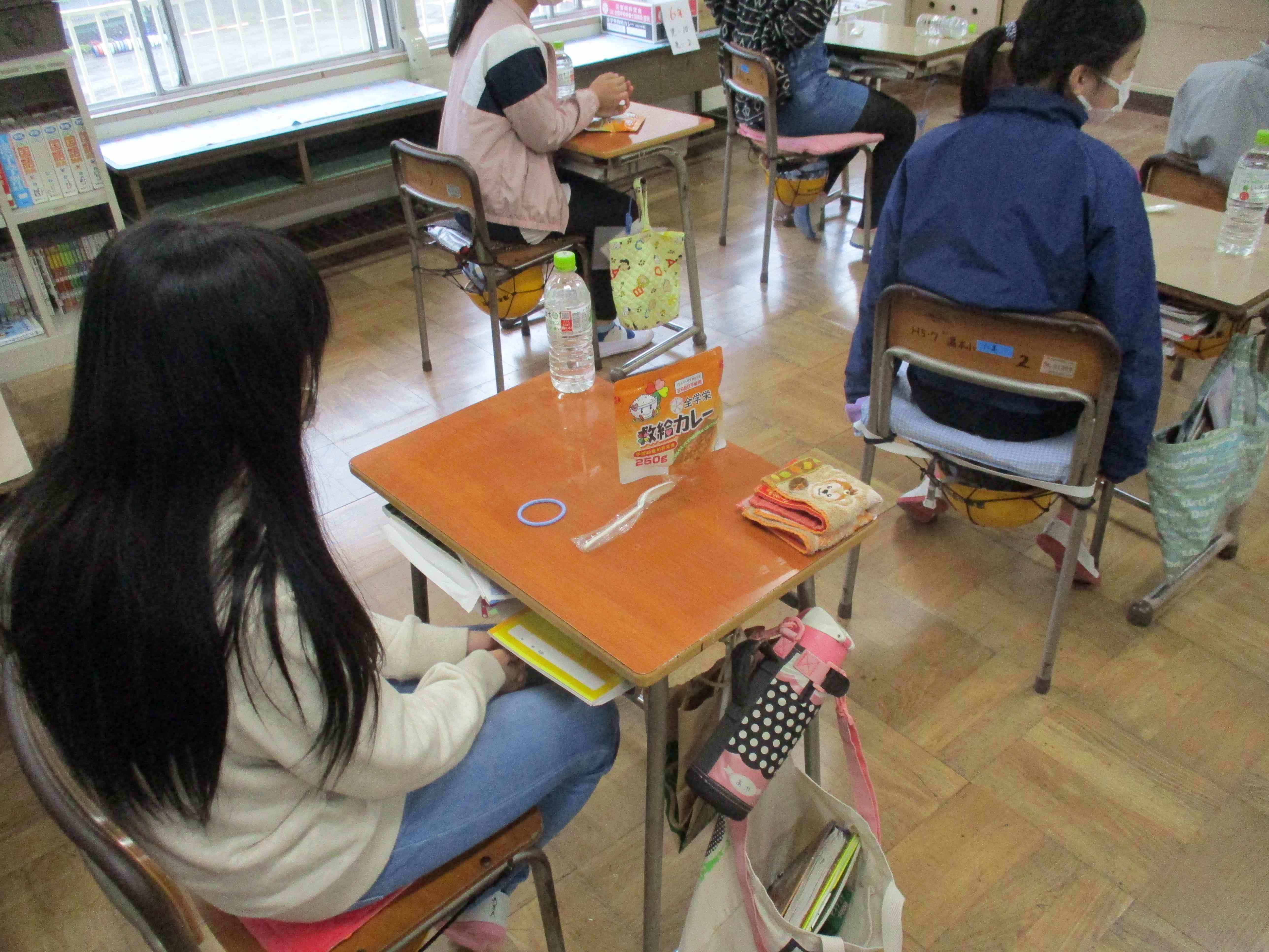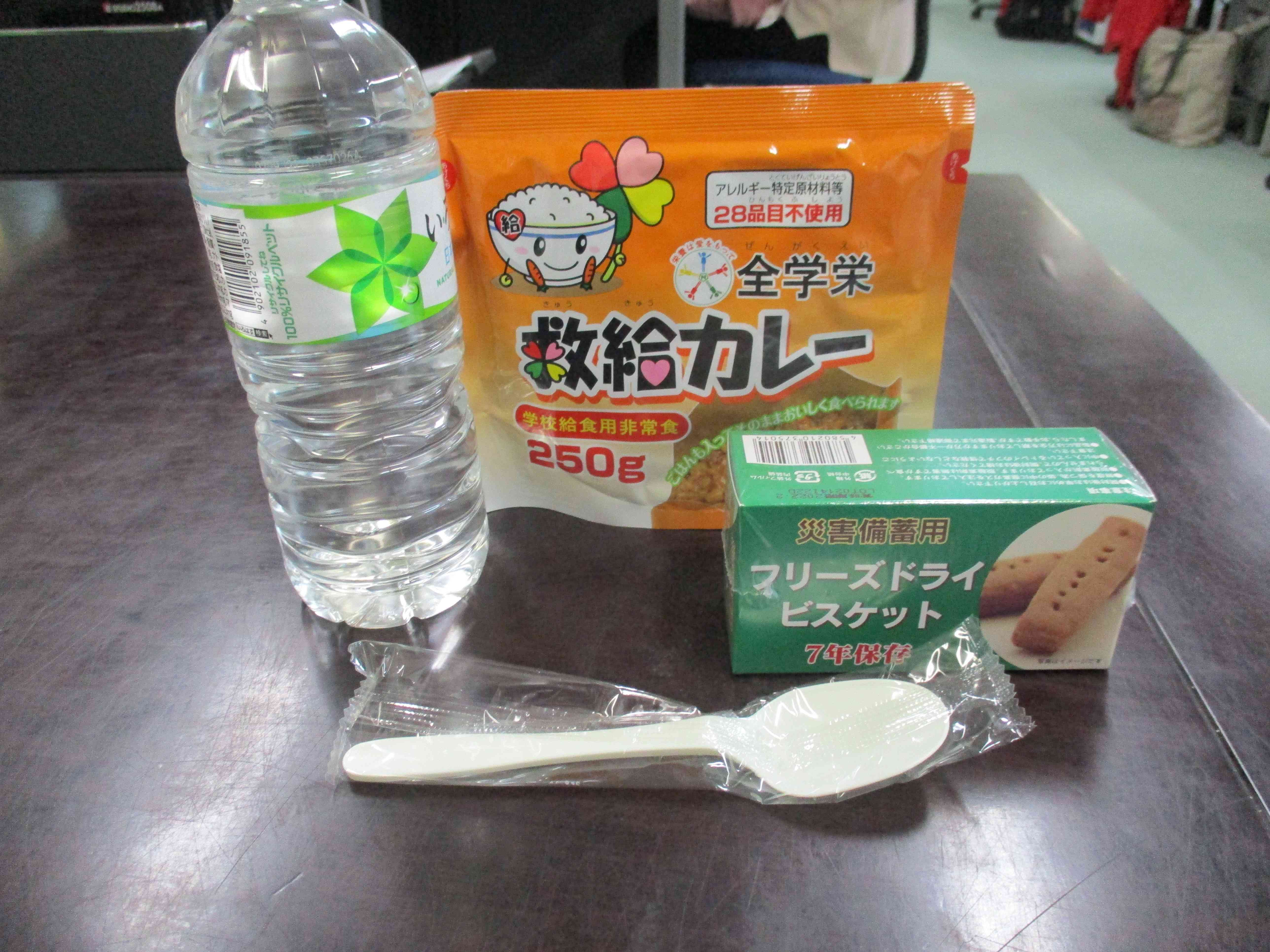 【今日の献立】 学校給食用非常食救食カレー 飲料水500ml 【栄養教諭・防災担当から】 今日は、防災給食です。近年、豪雨災害や土砂災害など大きな災害が発生しています。日頃、不自由なく食べることができている食事が災害時にどうなるのかということについて考えると同時に、非常用保存食を給食として試食することで防災についての意識を高めることをねらいとしています。