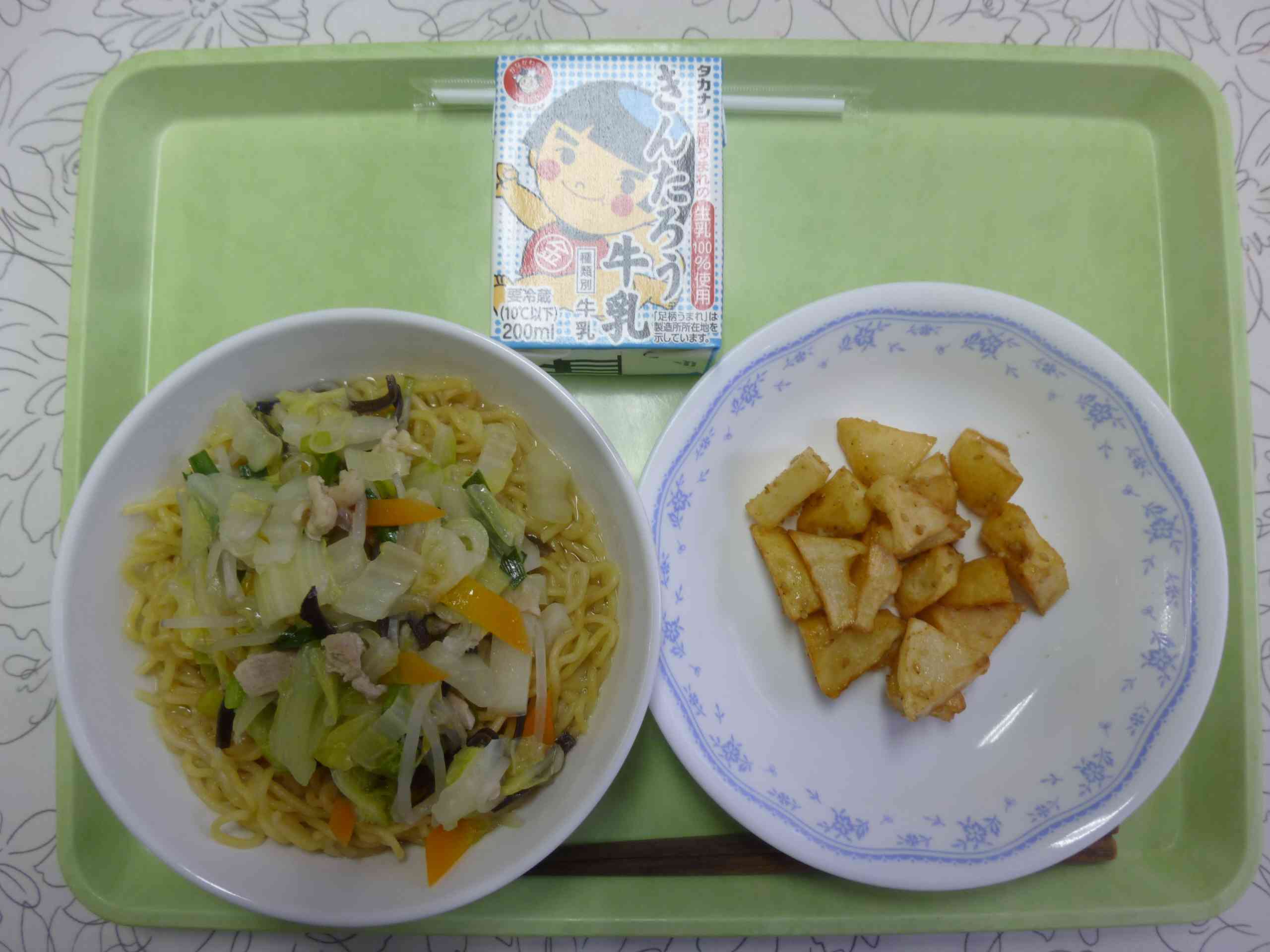 【今日の献立】 タンメン 牛乳 ポテトのごまがらめ 【栄養教諭から】 今日はタンメンです。野菜を煮込んで作るのがタンメン、炒めた野菜を上にのせるのが塩ラーメン、野菜も麺も煮込むのがチャンポンと言われています。煮込んだスープには栄養と旨味がとけこんでいます。今日は完食を期待できそうな献立です。