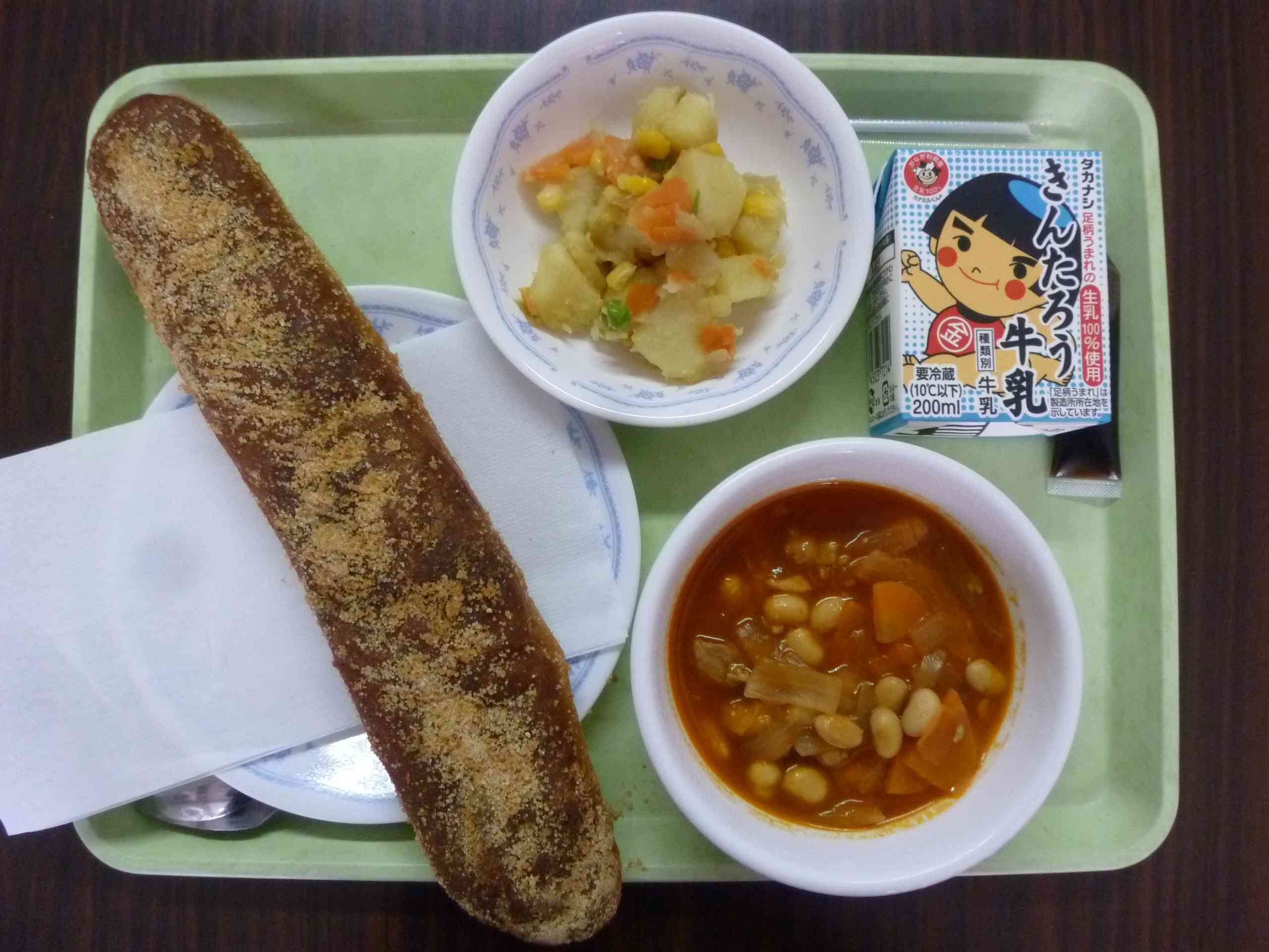 【今日の献立】 鬼に金棒パン 牛乳 ポークビーンズ ホットポテサラ ミルメーク 【栄養教諭から】 今日の「はこねランチ」は、節分にちなんで、毎年おなじみになってきた「鬼に金棒パン」です。長くスティック状の黒パンに節分にはかかせない大豆からできているきな粉をかけて揚げました。まさしく鬼の金棒のようですね。 そして、大豆を使ってポークビーンズも献立に入れました。