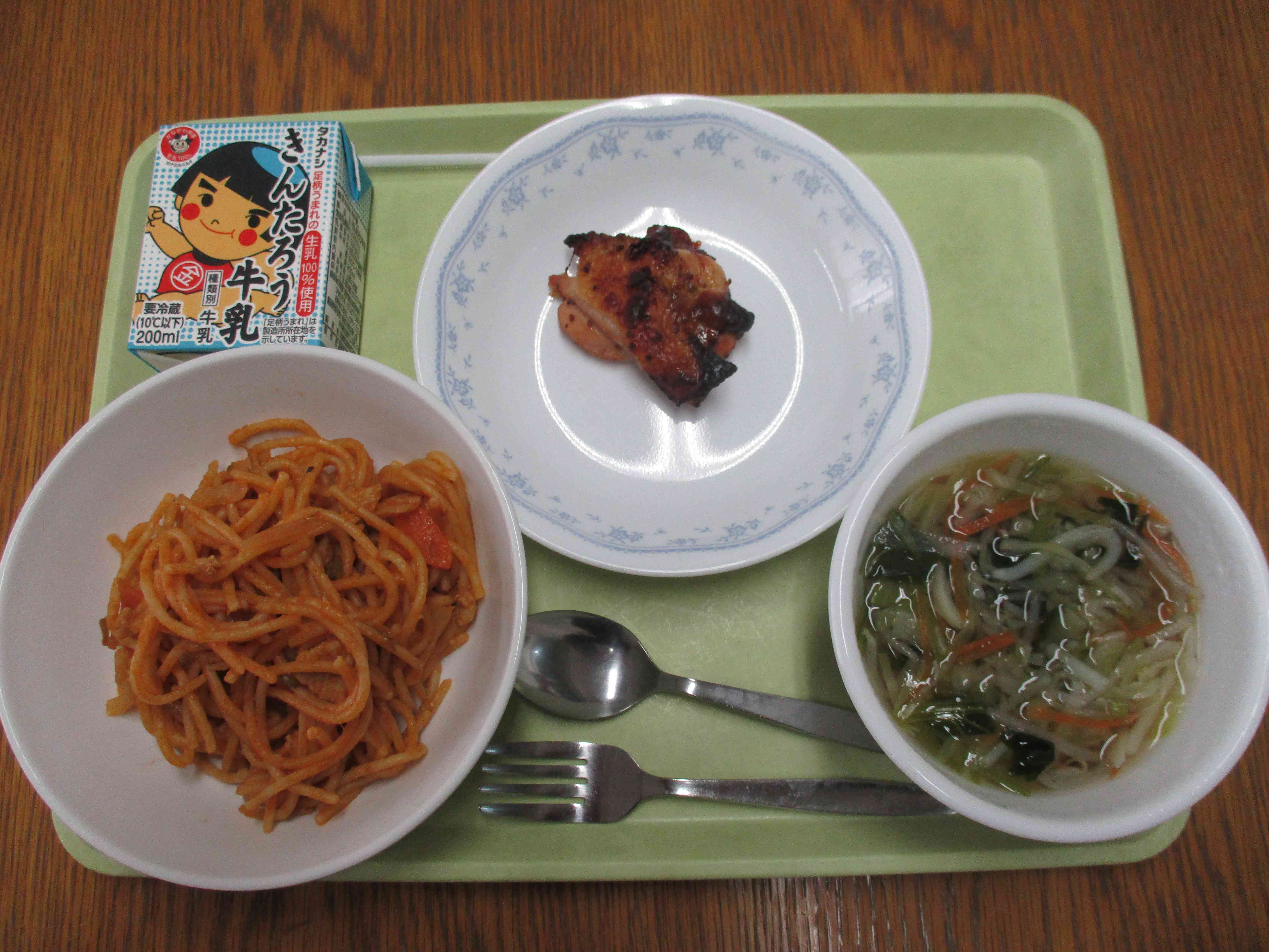 【今日の献立】 スパゲティナポリタン 牛乳 コンソメスープ ハニーマスタードチキン 【栄養教諭から】 今日は、横浜生まれのスパゲティ「ナポリタン」です。玉ねぎやウインナーなどの具と麺をケチャップで和えるナポリタン、彩りのピーマンは欠かせないそうです。とは言え、給食ではよく炒めてしまうので彩りよくとはいきませんでした。今日はウインナーの代わりに鶏肉を入れて作りました。