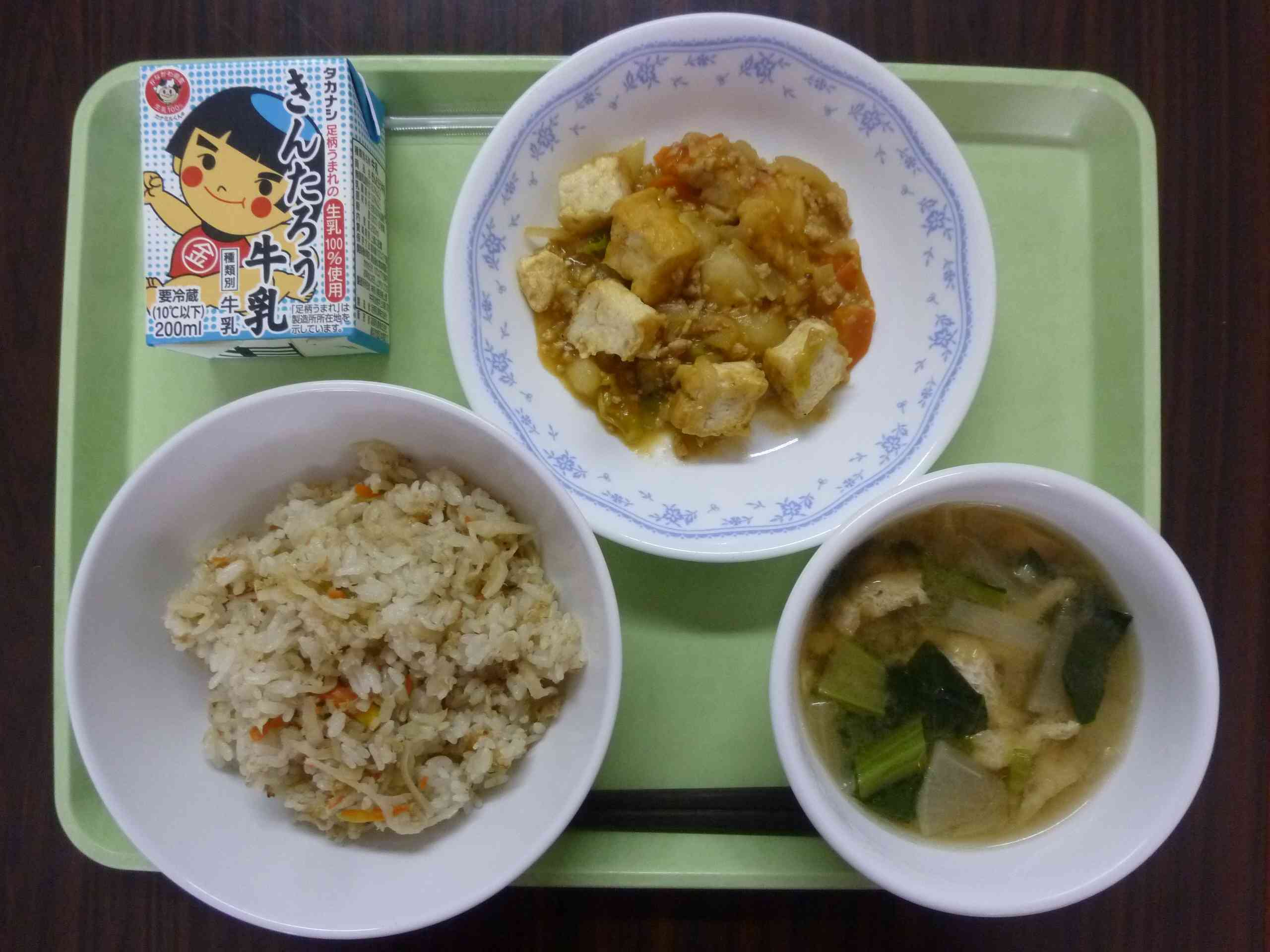 【今日の献立】 ツナの炊き込みご飯 牛乳 大根のみそ汁 生揚げの四川煮 【栄養教諭から】 今日はピリ辛の生揚げの四川煮です。トウバンジャンとケチャップ等で煮ました。四川料理は辛さが特徴です。高温多湿な気候から辛い料理で汗をかいてすっきりするためや、香辛料で食材が傷むのを防ぐためだそうです。辛さにも、しびれる辛さや酸っぱい辛さなど6つの辛味があり、それぞれが料理のおいしさとなっています。
