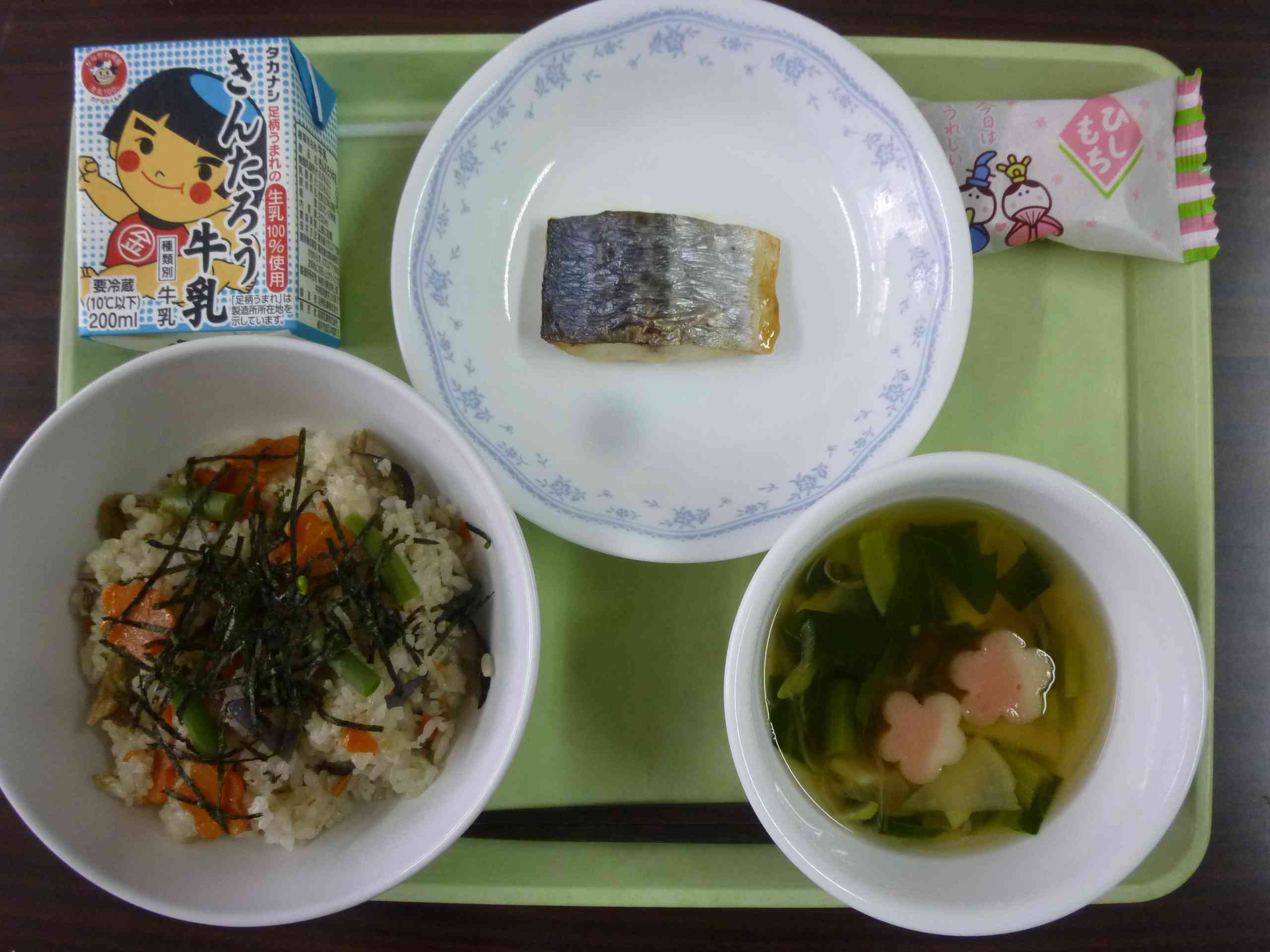 【今日の献立】 ちらし寿司 牛乳 すまし汁 さわらの西京焼き ひし餅 【栄養教諭から】 今日は一日遅れのひなまつり献立です。季節の節目である節句。五節句の一つである「上巳の節句(ひなまつり)」は女子の成長を願う日です。ひなまつりの行事食の一つ「ひしもち」は、桃色=魔除け、白=清浄、緑=健康と三つの色それぞれに願いが込められています。また、色の順番にも意味があり、下から緑・白・桃の順に重ね、「雪が溶けて、大地に草が芽吹き、桃の花が咲く」様子を表し春の訪れを感じることができます。【添付ファイル】