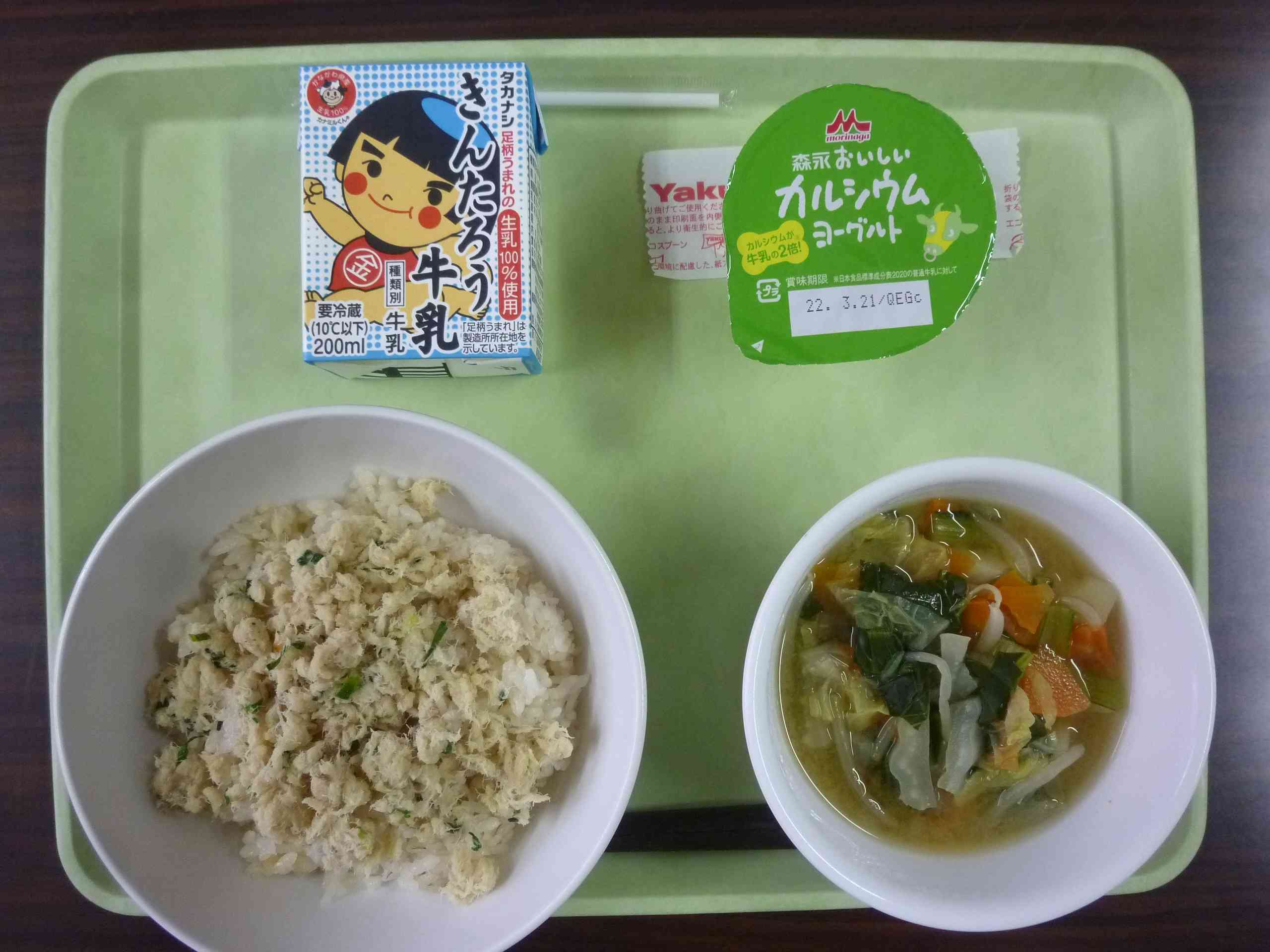 【今日の献立】 鯛めし 牛乳 野菜のみそ汁 カルシウムヨーグルト 【栄養教諭から】 今日はあと一週間程で卒業を迎える6年生へ少し早いお祝い献立です。「おめでタイ!!」鯛めしです。 みなさんは、鯛めしと聞くとどんな料理を思い浮かべますか?私は鯛を豪快に炊き込んだ鯛めしです。今日の鯛めしは、鯛を蒸したあとほぐし、甘辛く味付けをしています。これはおとなり小田原市では一般的な鯛めしだそうです。鯛のうま味をギュギュギュッとぎょうしゅくしたそぼろはとても美味です。【添付ファイル】