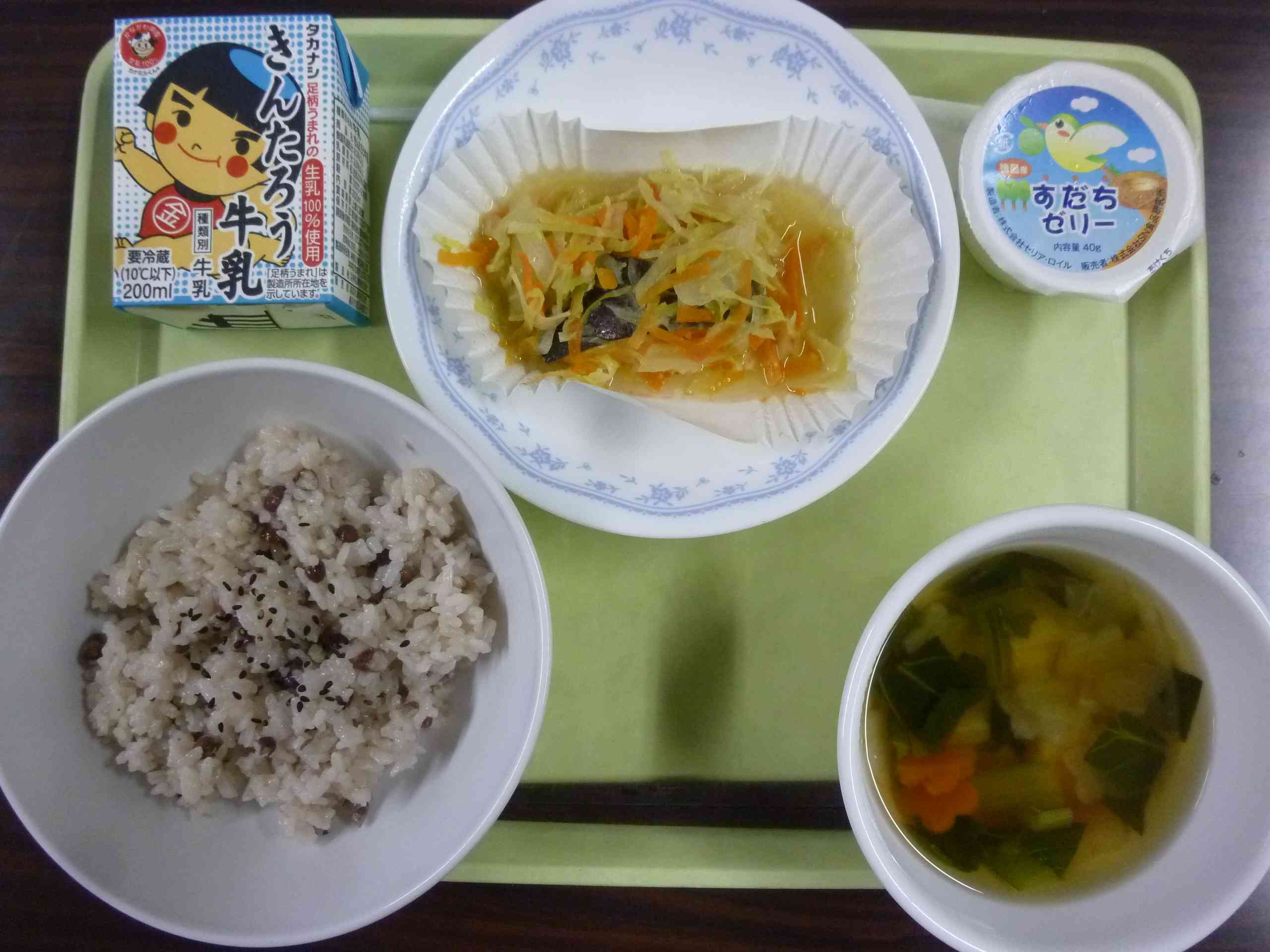 【今日の献立】 お赤飯 牛乳 すまし汁 鮭のチャンチャン焼き すだちゼリー 【栄養教諭から】 今日は今年度最後の、6年生にとっては小学校最後の給食です。もちろん今日は卒業祝い献立で、お赤飯(はこねランチ)です。 私は2年生の時から5年間、今の6年生の子たちの給食を作り、見守ってきました。苦手な物が多かった子、量がなかなか食べられなかった子、小さかった彼らも今ではほぼ毎日完食するほどになり、大きく成長した姿に胸がいっぱいです。今日の献立もきっと完食してくれると思います。【添付ファイル】