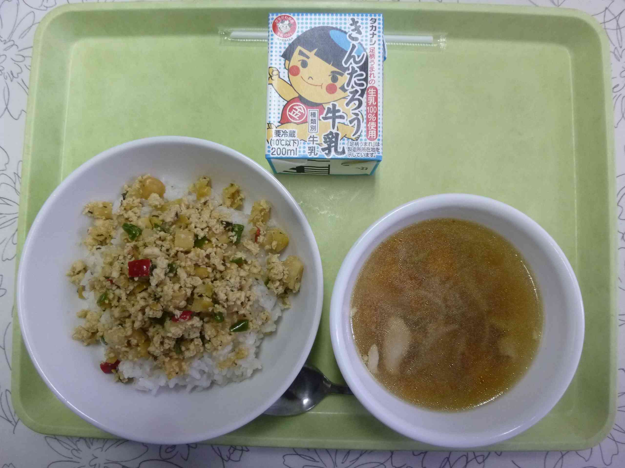 【今日の献立】 ガパオライス 牛乳 春雨スープ 【栄養教諭から】 今日はタイの料理「ガパオライス」です。ガパオとはホーリーバジルのことです。バジルとタイの調味料ナンプラーで味付けをした具をごはんとまぜて食べます。 独特な香りなので、子どもたちにはどうかな?と昨年心配しましたが、とてもよく食べて好評でした。今日も残さず食べてくれるとよいなと思います。