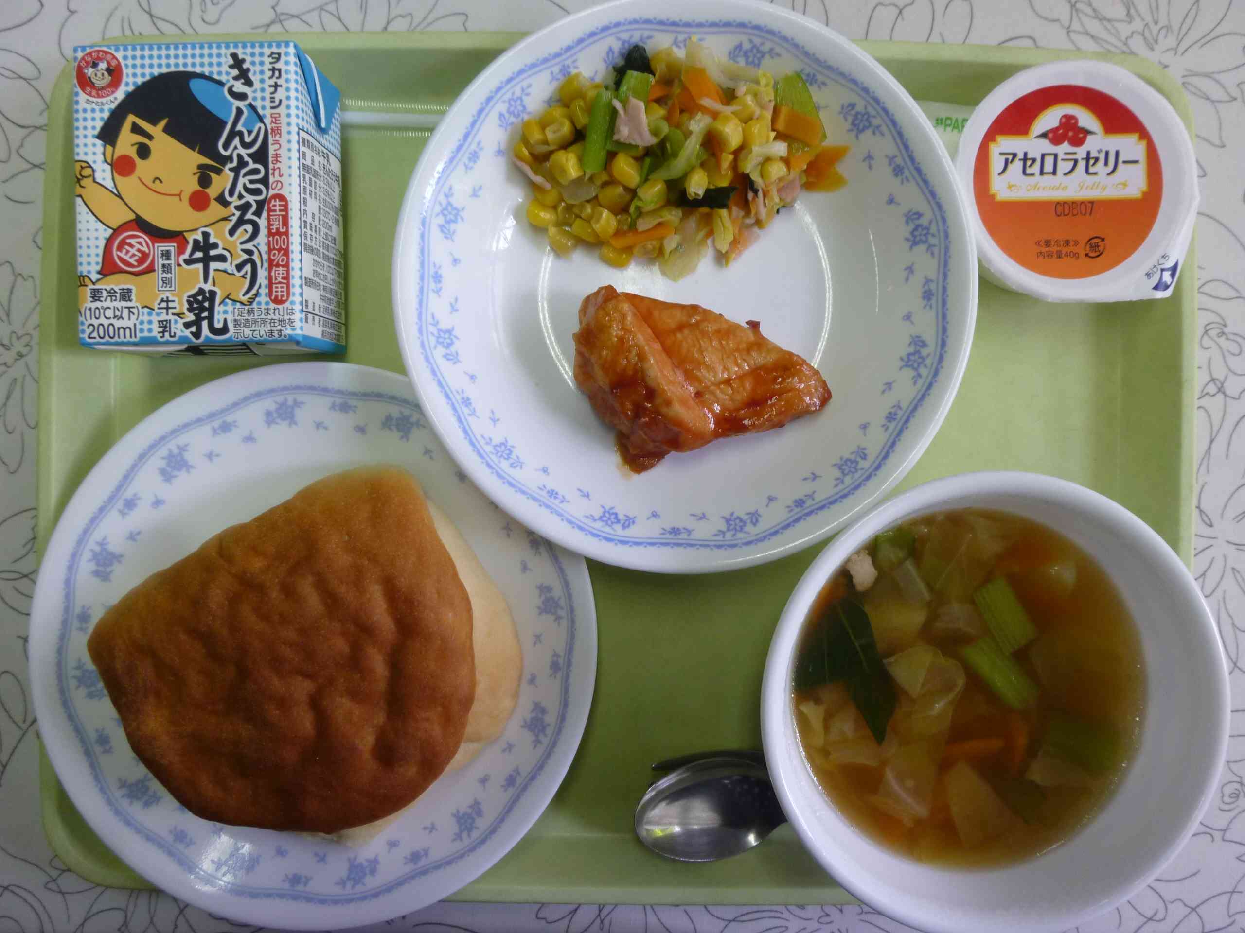 【今日の献立】 サンドパン 牛乳 ABCスープ 鶏肉のケチャップソース 野菜とハムのソテー アセロラゼリー 【栄養教諭から】 今日は好きな献立ランキングデザート部門の常連「アセロラゼリー」です。蒸し蒸しした日には、冷たくてさっぱりとしたゼリーがぴったりです。 アセロラはビタミンCが豊富な果物で、その量はレモンの34個分だそうです。給食のこのゼリーには、さらに鉄が強化されています。日差しが強くなるこれからの時期、お肌のためにもビタミンCをしっかりとりたいですね。【添付ファイル】