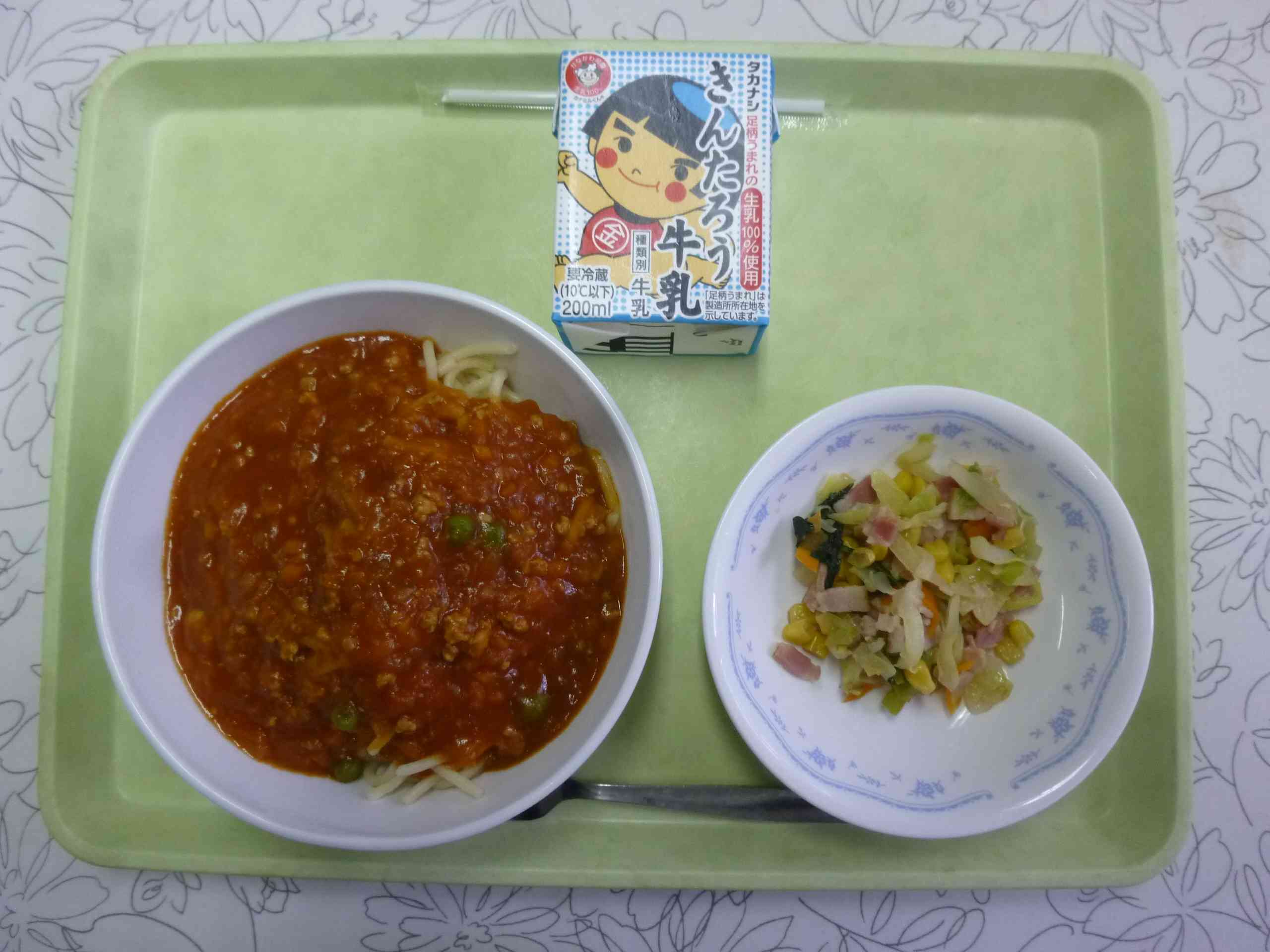 【今日の献立】 スパゲティミートソース 牛乳 野菜とベーコンのソテー 【栄養教諭から】 今日はミートソースです。ミートソースとボロネーゼは同じ料理のようですが正確には違うそうです。香味野菜とひき肉をトマトと赤ワインで煮込んで作るのがボロネーゼ。ボロネーゼをもとに、赤ワインは使わずケチャップ等で味付けしたのがミートソース。そして、一番の違いは麺です。ボロネーゼはタリアレッテという平打ち麺を使うのがポイントだそうです。【添付ファイル】