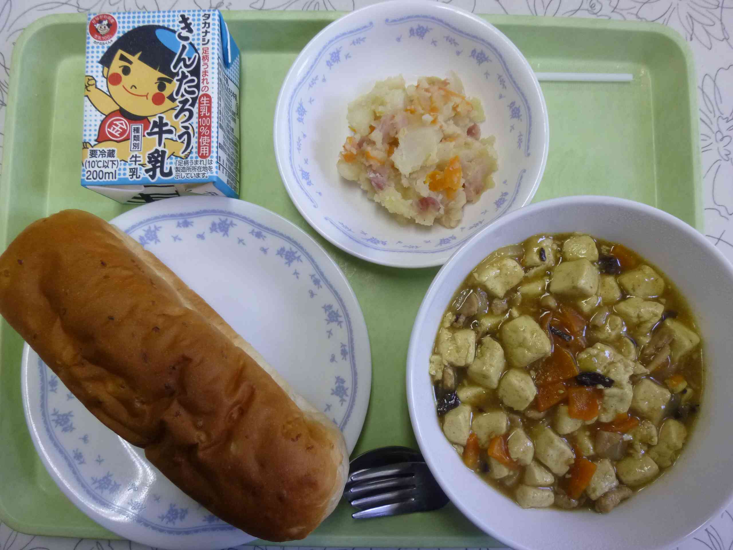 【今日の献立】 玄米パン 牛乳 豆腐のカレー煮 ジャーマンポテト 【栄養教諭から】 ドイツの家庭料理のジャーマンポテト。ドイツではじゃがいも料理がたくさんあり、結婚するまでに200種類以上覚えなければならないなどといわれるほどです。給食でも大活躍のじゃがいもですが、さすがに200ものレパートリーはなさそうです。熱に強いビタミンCが豊富に含まれています。