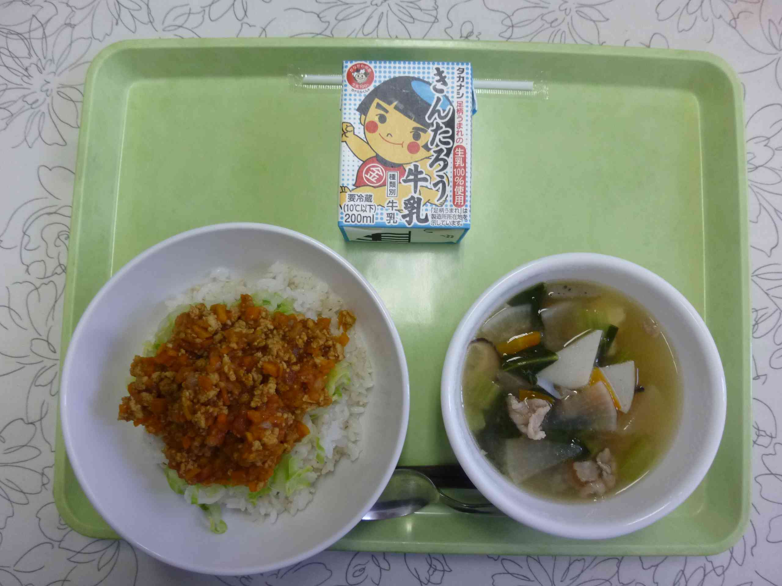 【今日の献立】 タコライス 牛乳 イナムドゥチ 【栄養教諭から】 今日ははこねランチで沖縄県の郷土料理のタコライスです。タコスの具がご飯の上にのったタコライス。タコス屋さんのまかない料理だったとか、米軍基地の近くで若いアメリカ兵に安くてボリュームのある食べ物をということで考えられたとか、発祥には諸説あるそうです。 ごはんの上にレタス、タコスミート、トマト、チーズなどをのせます。給食ではレタスの代わりにボイルキャベツをのせました。また、お汁もイナムドゥチという沖縄の郷土料理を合わせました。【添付ファイル】
