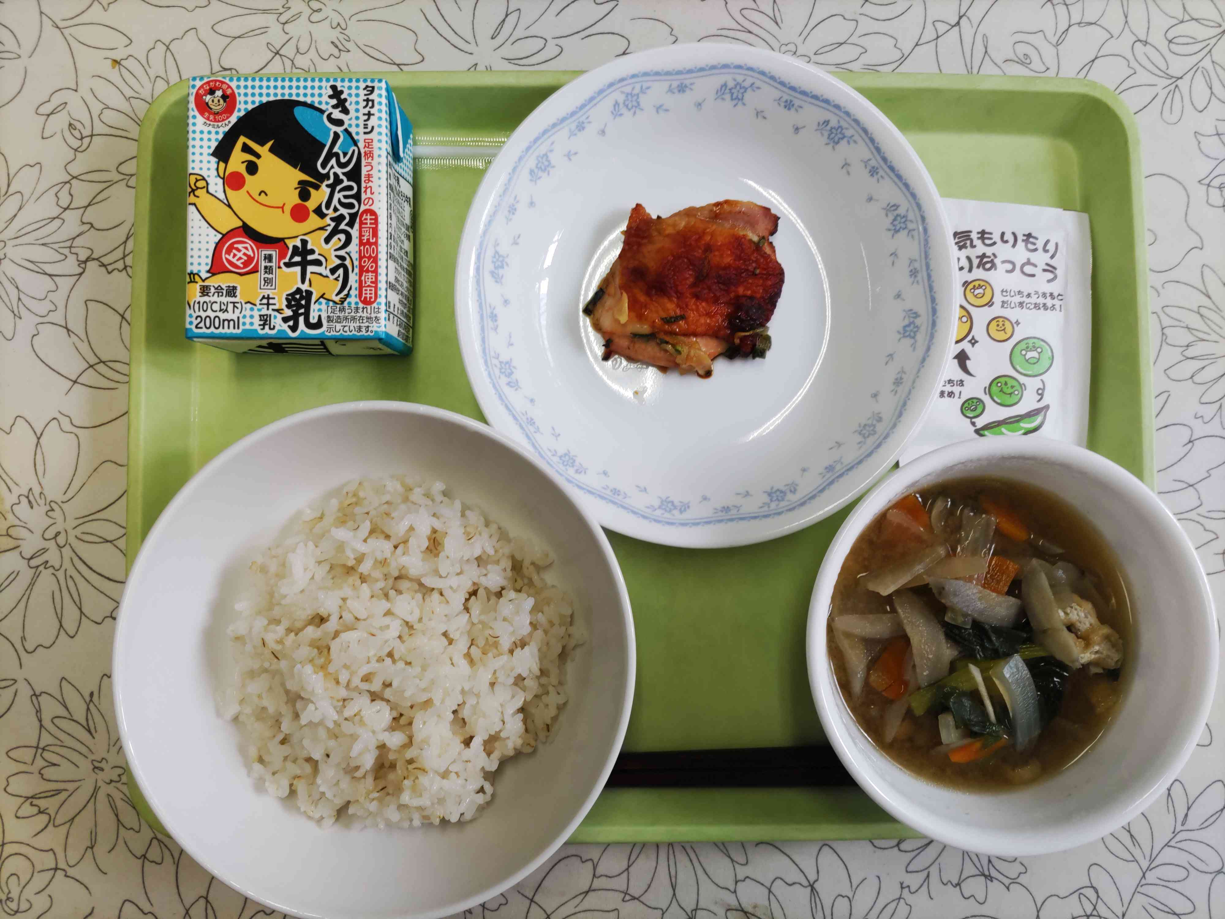 【今日の献立】 麦ごはん 牛乳 具だくさんみそ汁 とりの香味焼き 納豆ふりかけ 【栄養教諭から】 納豆ふりかけは、フリーズドライの納豆が入ったふりかけです。温かいご飯にかけるとねばりが出てきてとてもおいしいです。 子どもたちは、幼児学園の給食で納豆をよく食べていたとのことで、喜んで食べる子が多いです。