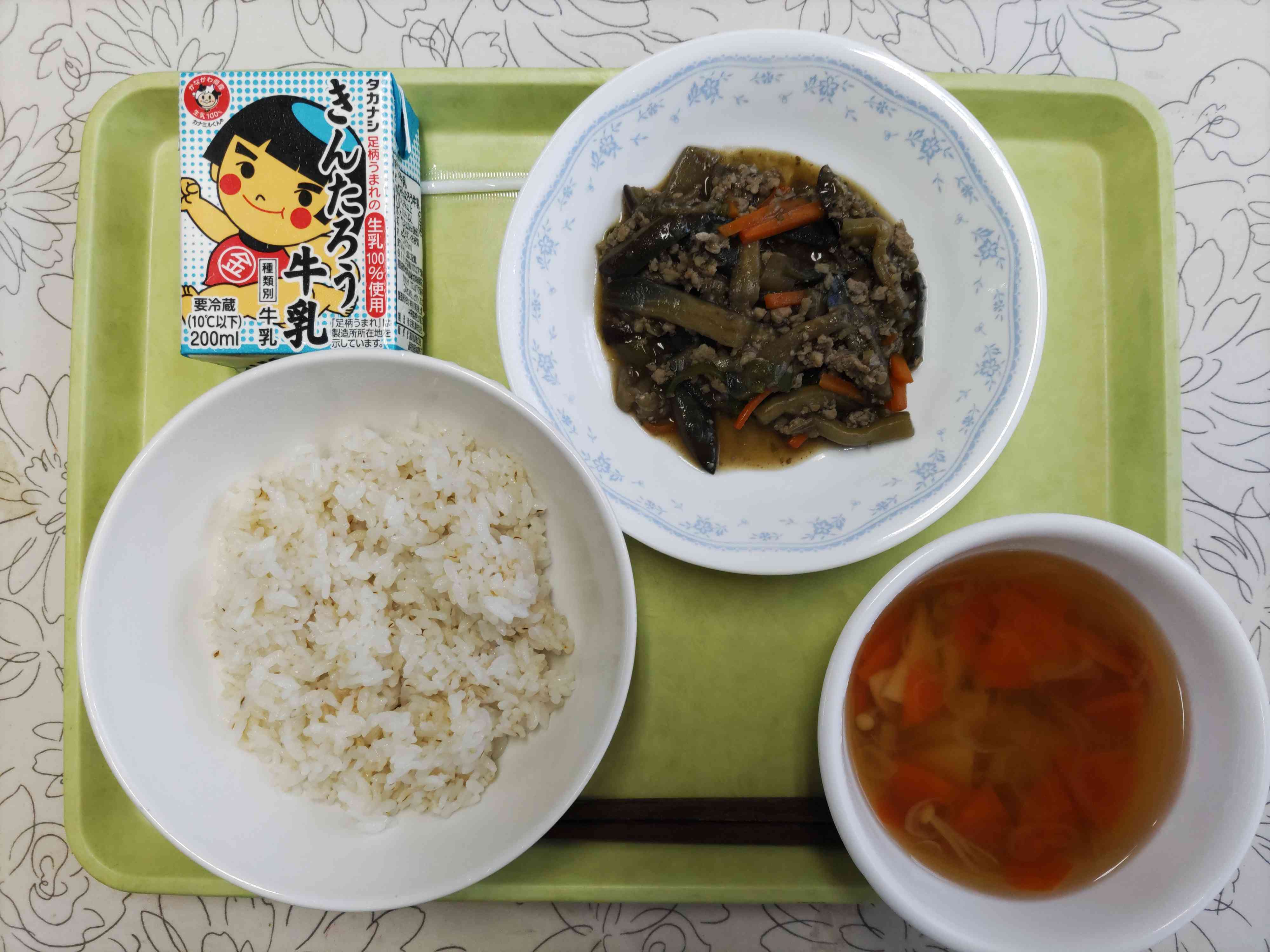 【今日の献立】 麦ごはん 牛乳 中華スープ マーボーナス 【栄養教諭から】 今日は旬のナスを使ったマーボーナスです。苦手な子が多いナス。やわらかく味がよくしみるように、皮をところどころむいて拍子切りにしました。 旬の味を楽しんでほしいです。