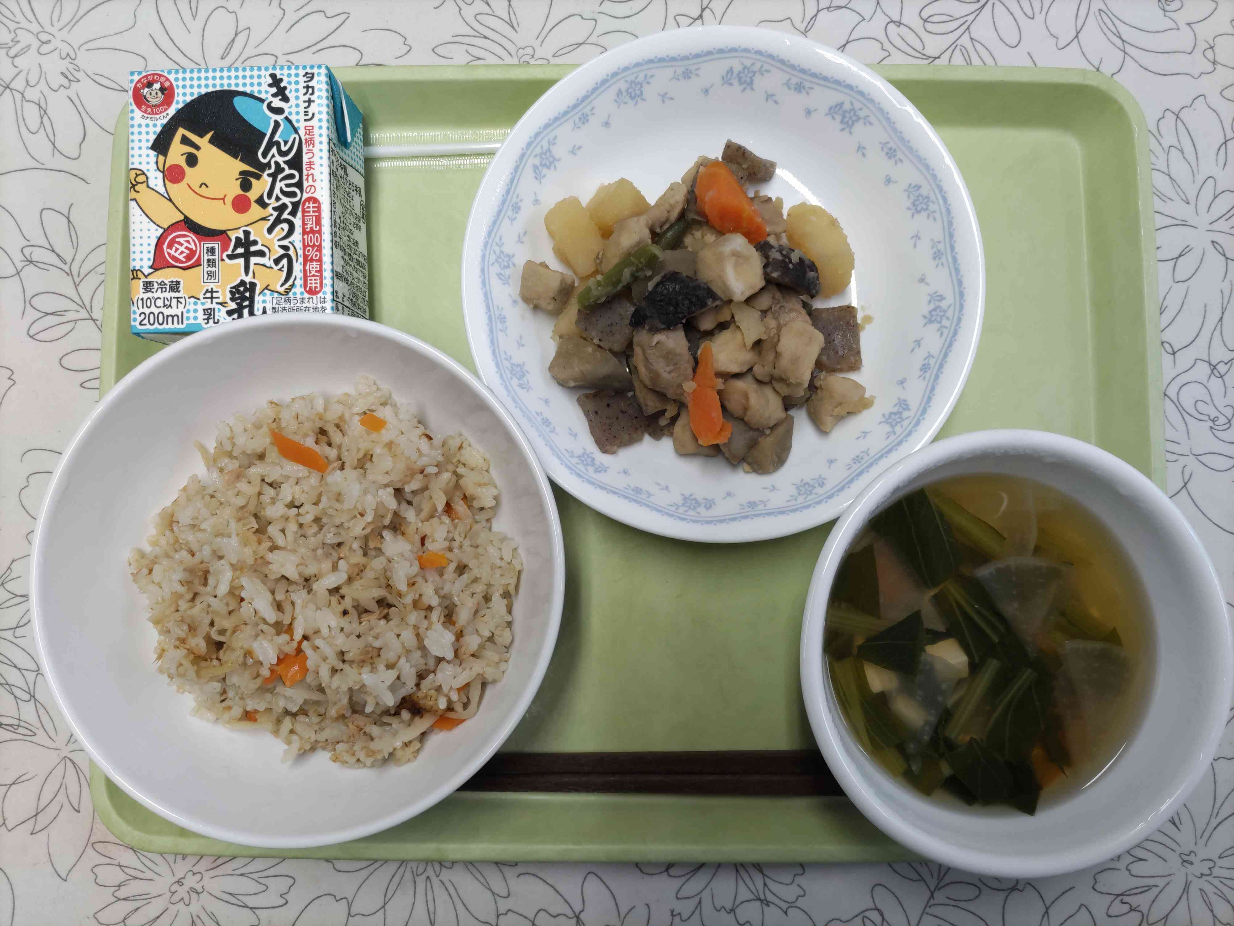 【今日の献立】 ツナの炊き込みご飯 牛乳 豆腐のすまし汁 鶏と野菜の煮物 【栄養教諭から】 ツナの炊き込みご飯には、千切りのしょうをたっぷり入れます。香りもさわやかになり、食べた時の味もとてもおいしくなります。炊飯時には水の代わりにだし汁で炊いています。給食では具を炒めてから炊き込んでいますが、具をそのまま炊き込んでもよいと思います。ぜひ、家庭でもお試しあれ!