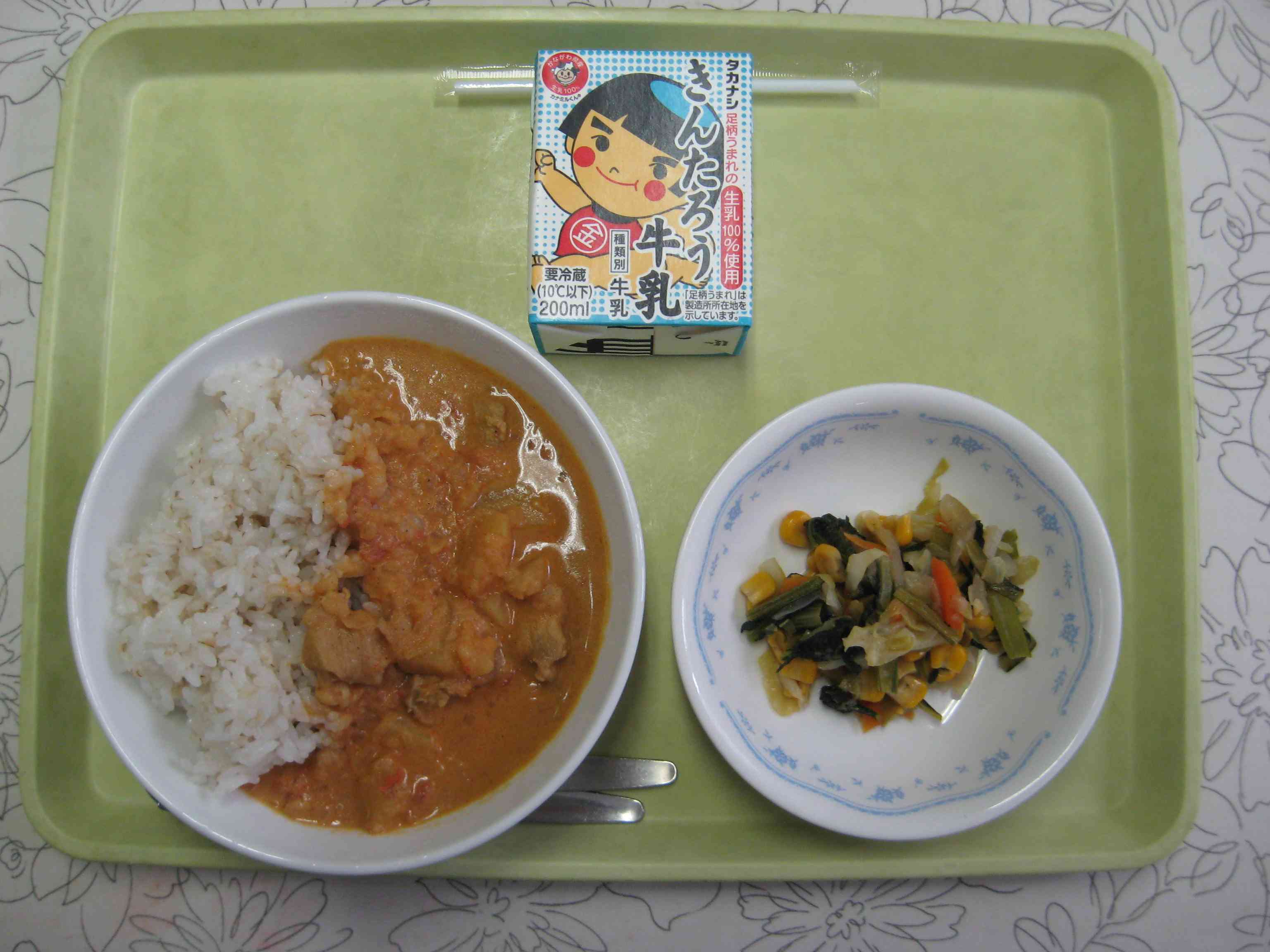 【今日の献立】 バターチキンカレー 牛乳 青菜とコーンのソテー 【栄養教諭から】 今日はバターチキンカレーです。ルウは作らず、生クリームやバターでコクを出しました。バターチキンカレーは、もともとタンドリーチキンを焼いた時に残る漬けだれを使って作ったのが始まりといわれています。トマトベースのさらっとしたカレーです。新メニューなので、子どもたちの反応が楽しみです。