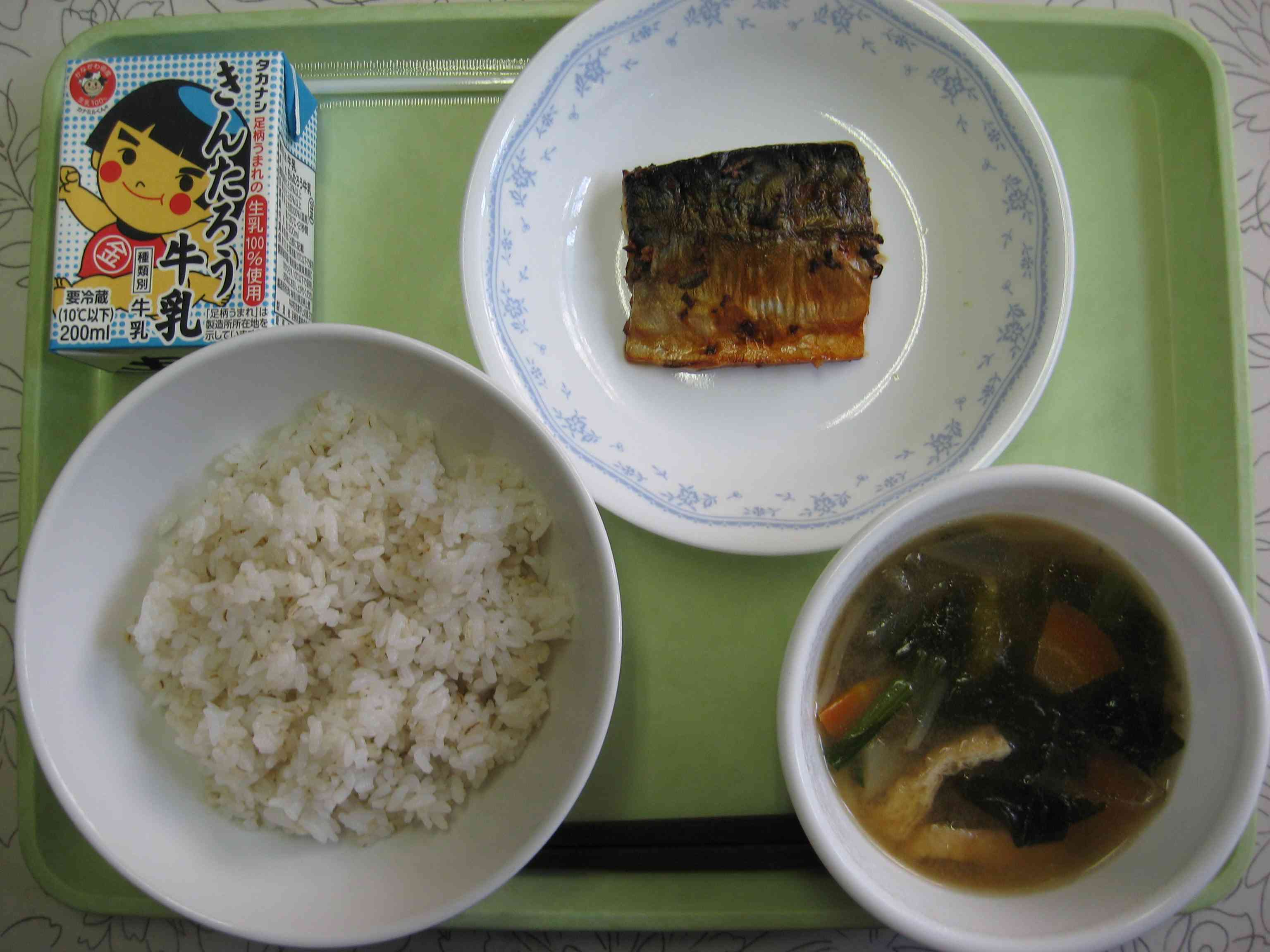 【今日の献立】 麦ごはん 牛乳 油あげのみそ汁 サバの香味焼き 【栄養教諭から】 今日は、さばの香味焼きです。香味野菜は、にんにく、しょうが、玉ねぎ、葉ねぎです。いつもと少し変えて玉ねぎをみじん切りにし、味をからみやすくしました。 最近1年生が栄養黒板に興味をもっていて、食べ物の色分けを手伝ってくれます。色分けを覚える子も出てきてうれしく思います。