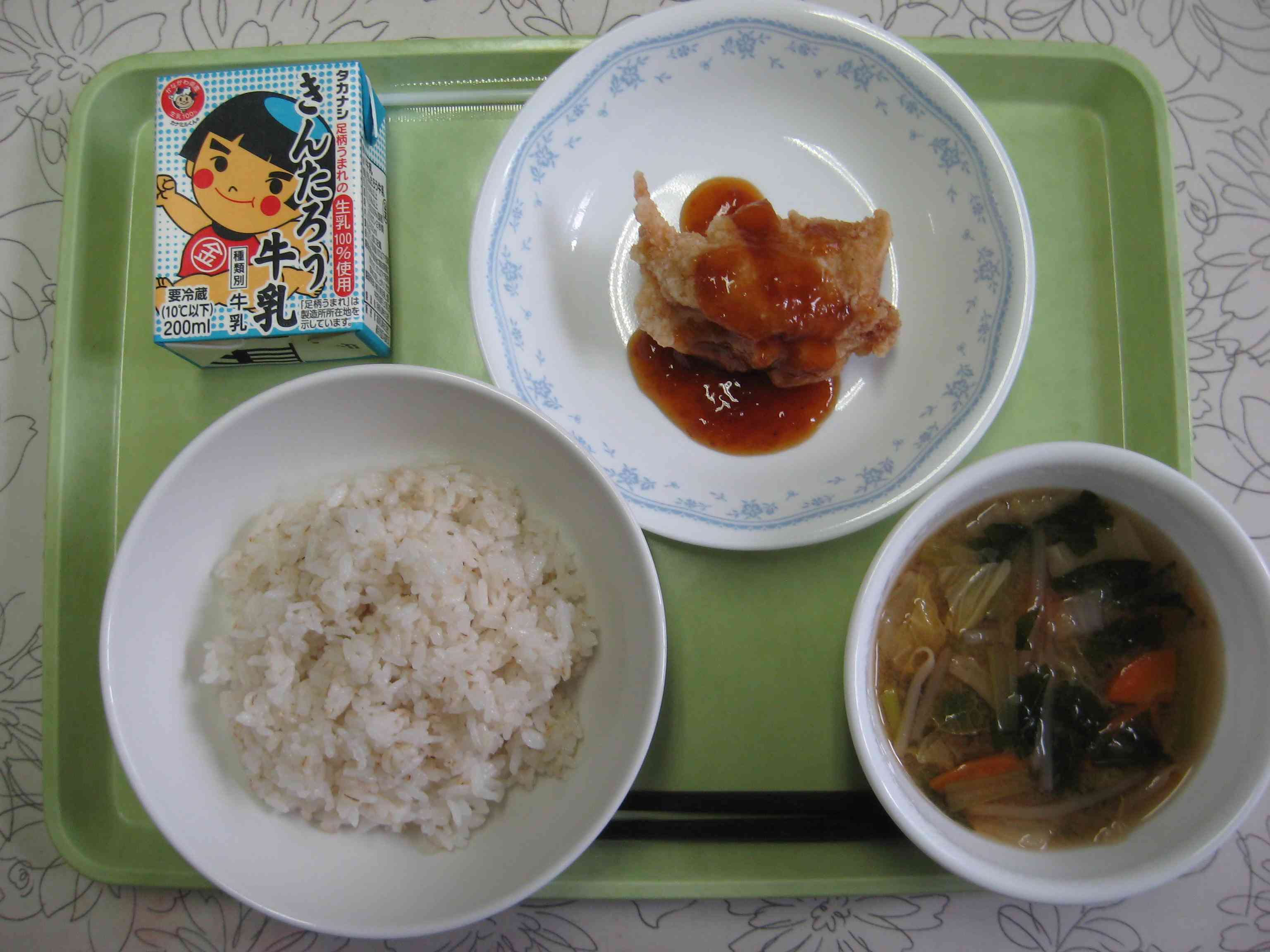 【今日の献立】 麦ごはん 牛乳 野菜のみそ汁 鶏のから揚げうめ~ソース 【栄養教諭から】 今日はから揚げにうめ~梅ソースをかけました。梅干を細かくたたいて、しょう油ベースのソースを作りました。酸味が苦手な子も食べやすいようにはちみつの甘味も加えています。