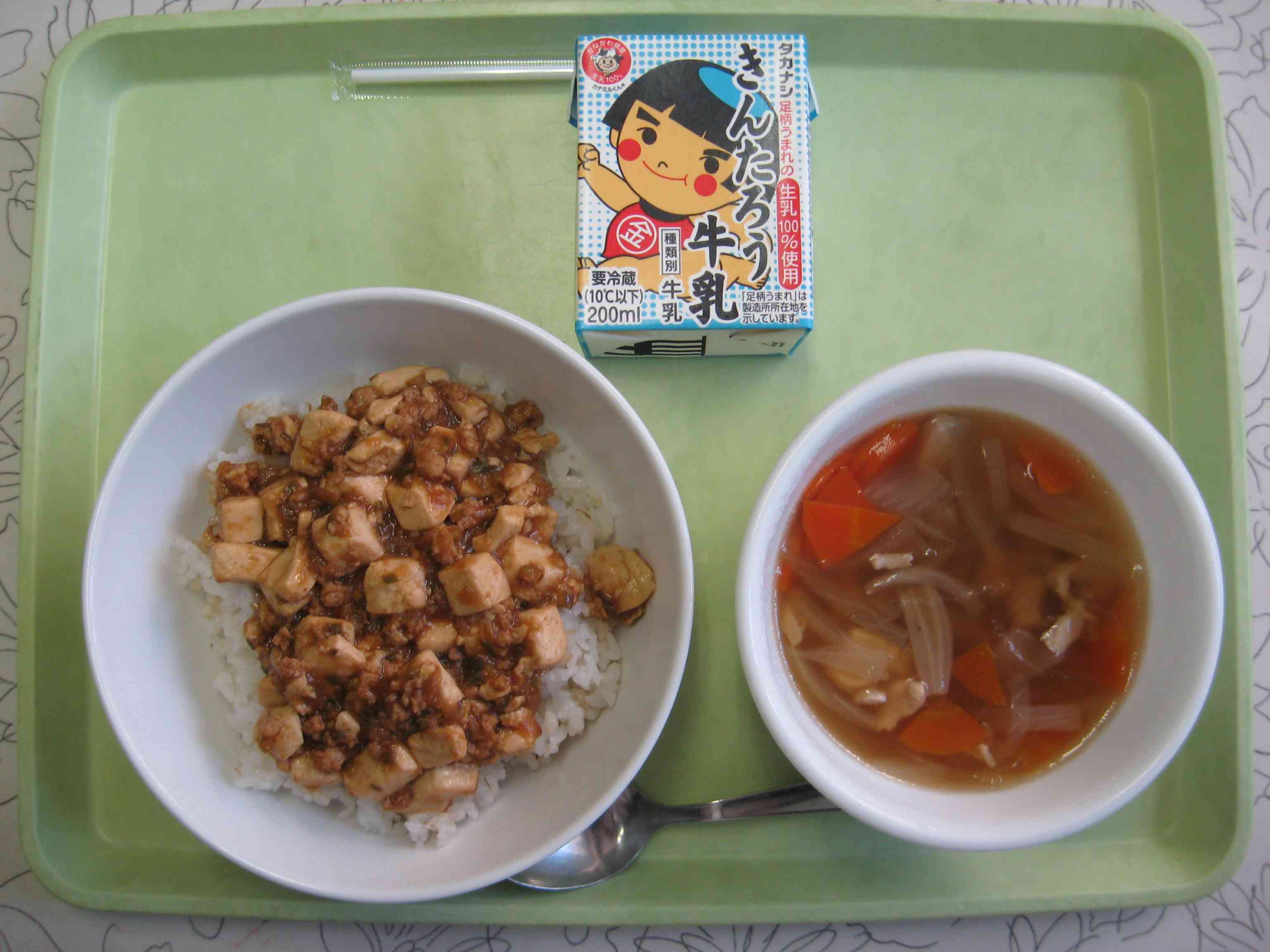 【今日の献立】 マーボーどん 牛乳 中華スープ 【栄養教諭から】 今日はマーボー豆腐をご飯にのせたマーボー丼です。豆腐はなめらかな絹豆腐を使います。一度下茹でをしてから加えるとくずれにくく、また水っぽくなりにくいのでおすすめです。今日は赤みそと八丁みその2種類のみそを使ったのでコクのあるマーボー豆腐に仕上がりました。