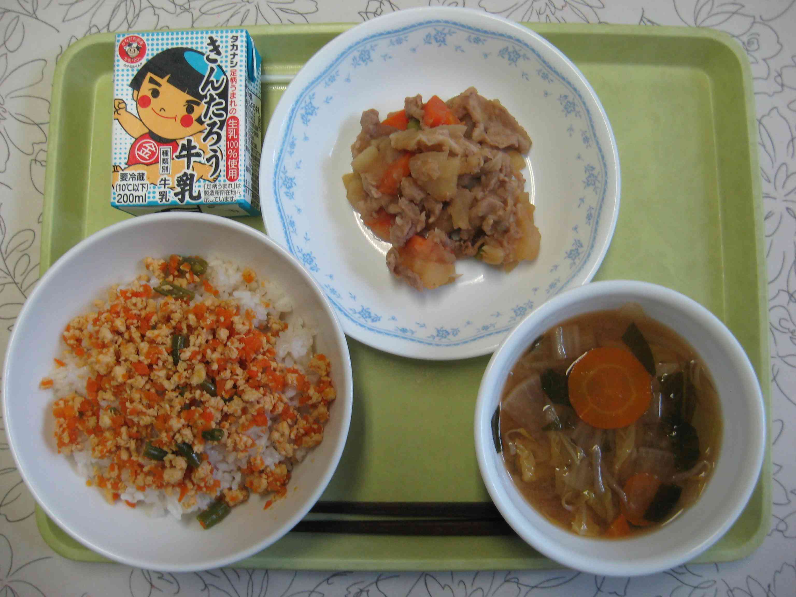 【今日の献立】 鶏そぼろごはん 牛乳 野菜のみそ汁 肉じゃが 【栄養教諭から】 今日はみそ汁に、あおぞら級が育てた「にんじん」を使いました。八百屋さんの物はいちょう切りに、あおぞら級の物は輪切りにしました。にんじんは一年中使いますが、旬は5月頃と10月~12月頃です。地産地消を学ぶ良い機会となりました。