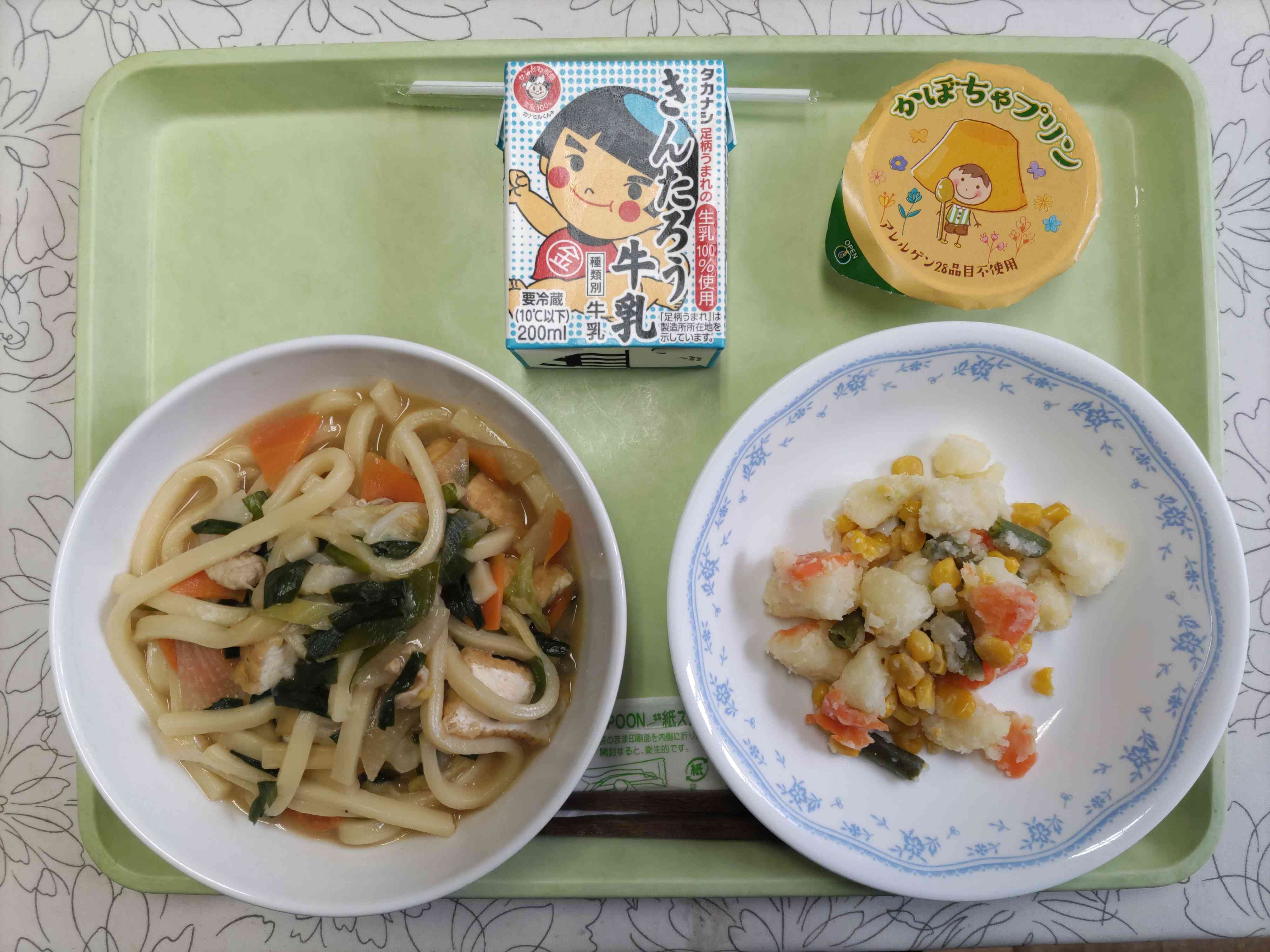 【今日の献立】 チゲうどん 牛乳 三食ポテト かぼちゃプリン 【栄養教諭から】 今日はチゲうどん。チゲというとピリ辛味のイメージですが、本場の韓国では「なべ」という意味です。今日は韓国風にコチジャンを使って味付けをした具だくさんの煮込みうどんです。冬にぴったりですね。デザートには、アレルギーのある子も食べられるかぼちゃのプリンです。