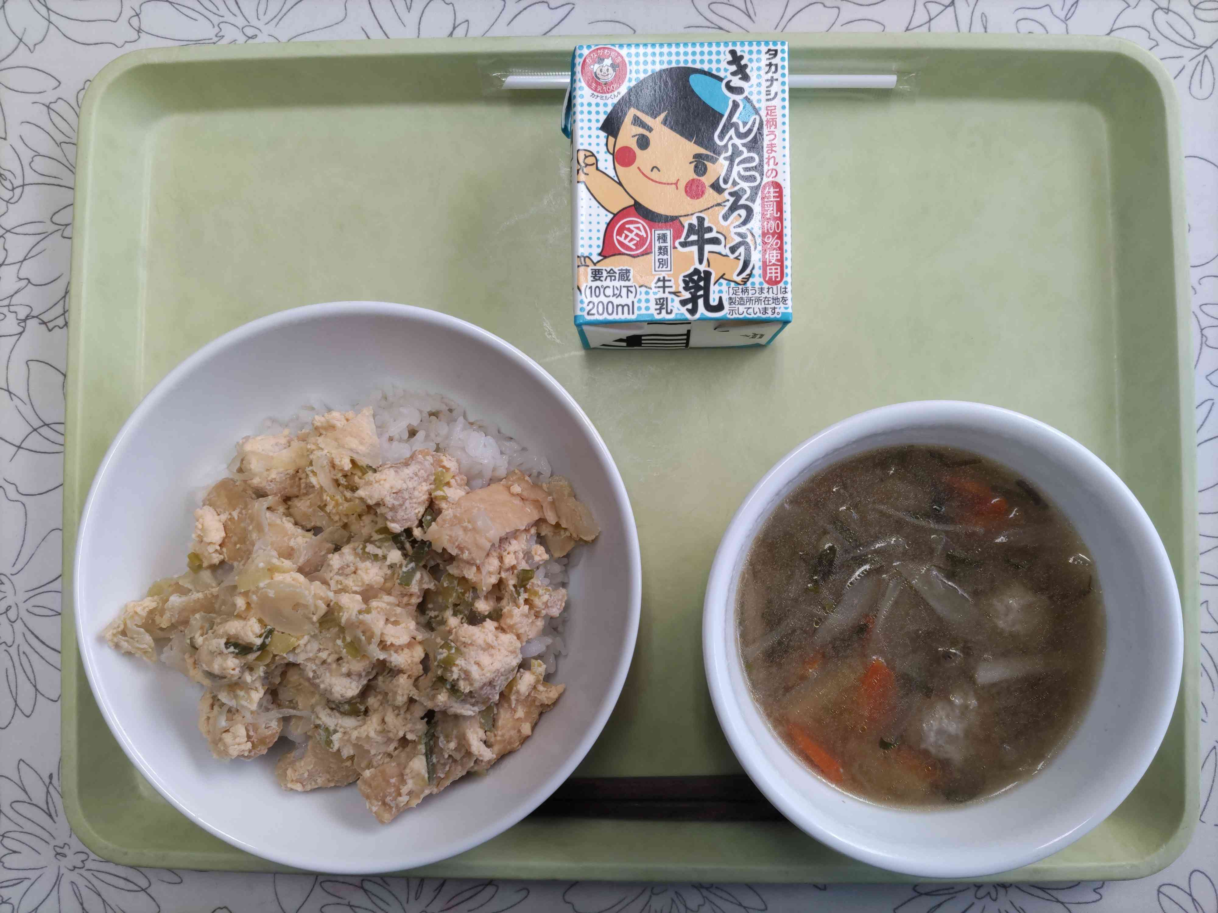 【今日の献立】 衣笠丼 牛乳 鶏団子のみそ汁 【栄養教諭から】 今日は京都の郷土料理「衣笠丼」です。甘辛く炊いた油揚げを長ねぎと一緒に卵でとじたシンプルな丼ぶりです。名前は京都にある衣笠山に由来します。説は色々あるようで、衣笠丼の見た目が雪景色の衣笠山に似ているから、とか、衣笠山にはキツネがよく出るからなどといわれています。