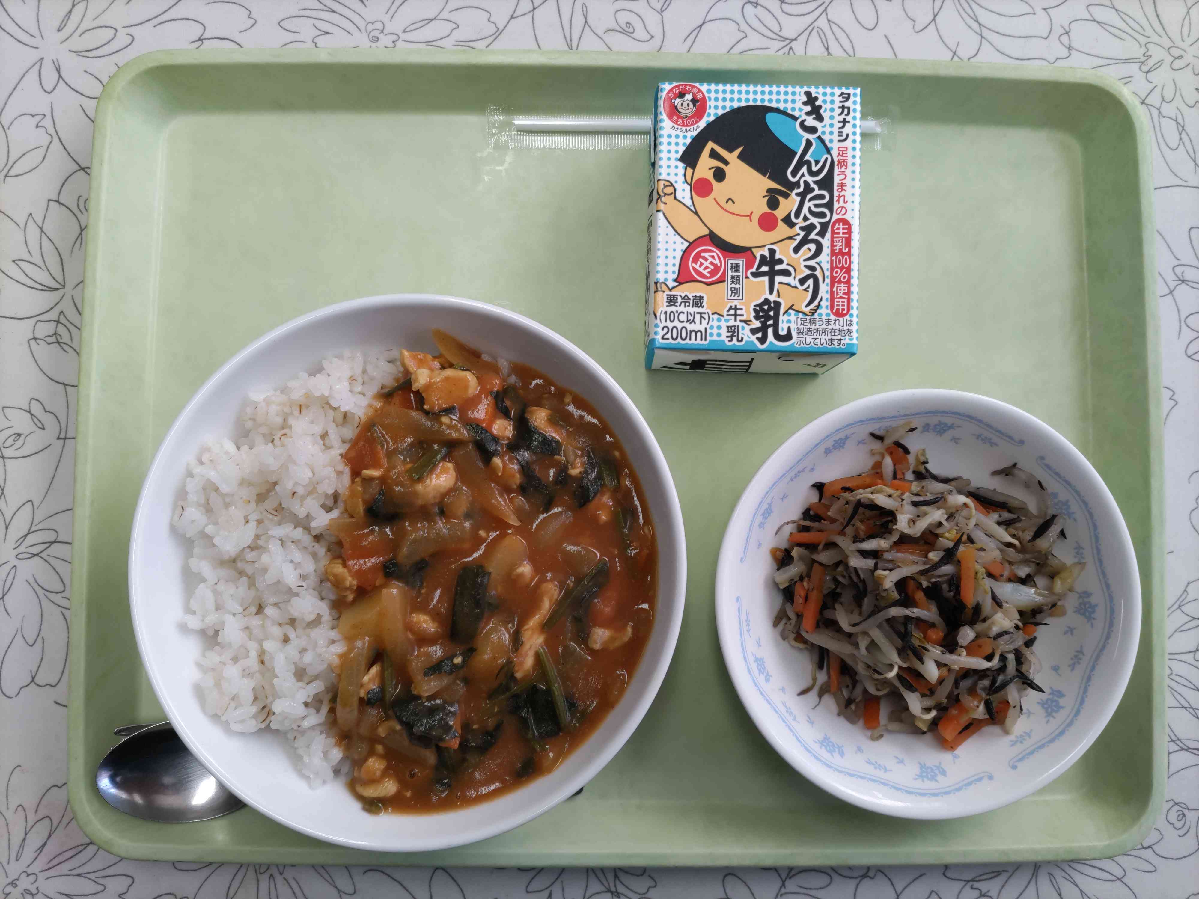 【今日の献立】 ポパイカレー 牛乳 ひじきのごま酢炒め 【栄養教諭から】 ポパイカレーといえば、そうです。ほうれん草が入ったカレーです。ほうれん草を食べるとパワーアップするアメリカのマンガのキャラクター「ポパイ」からつけました。マンガの中だけでなく栄養満点のほうれん草は冬が旬の野菜です。夏採れよりもビタミン等が多くなります。